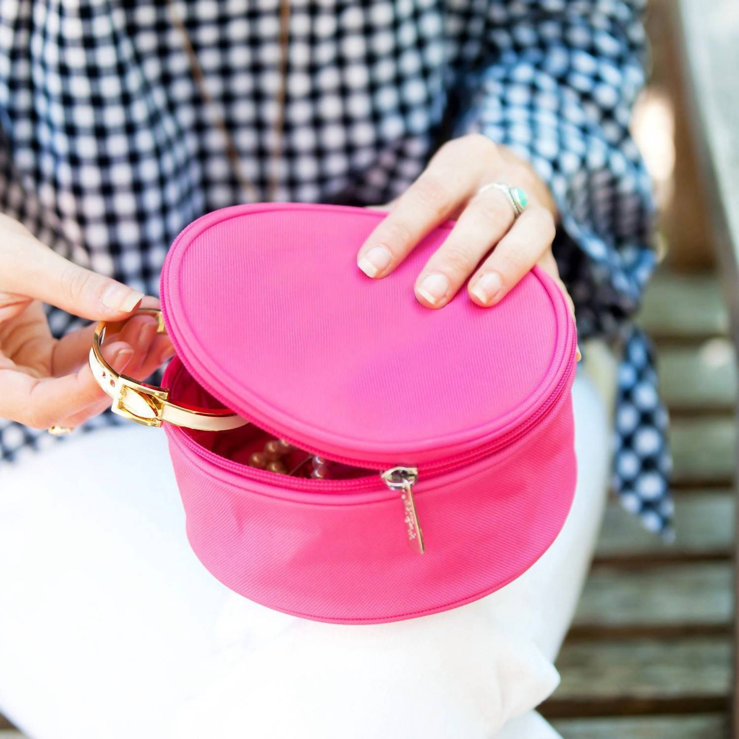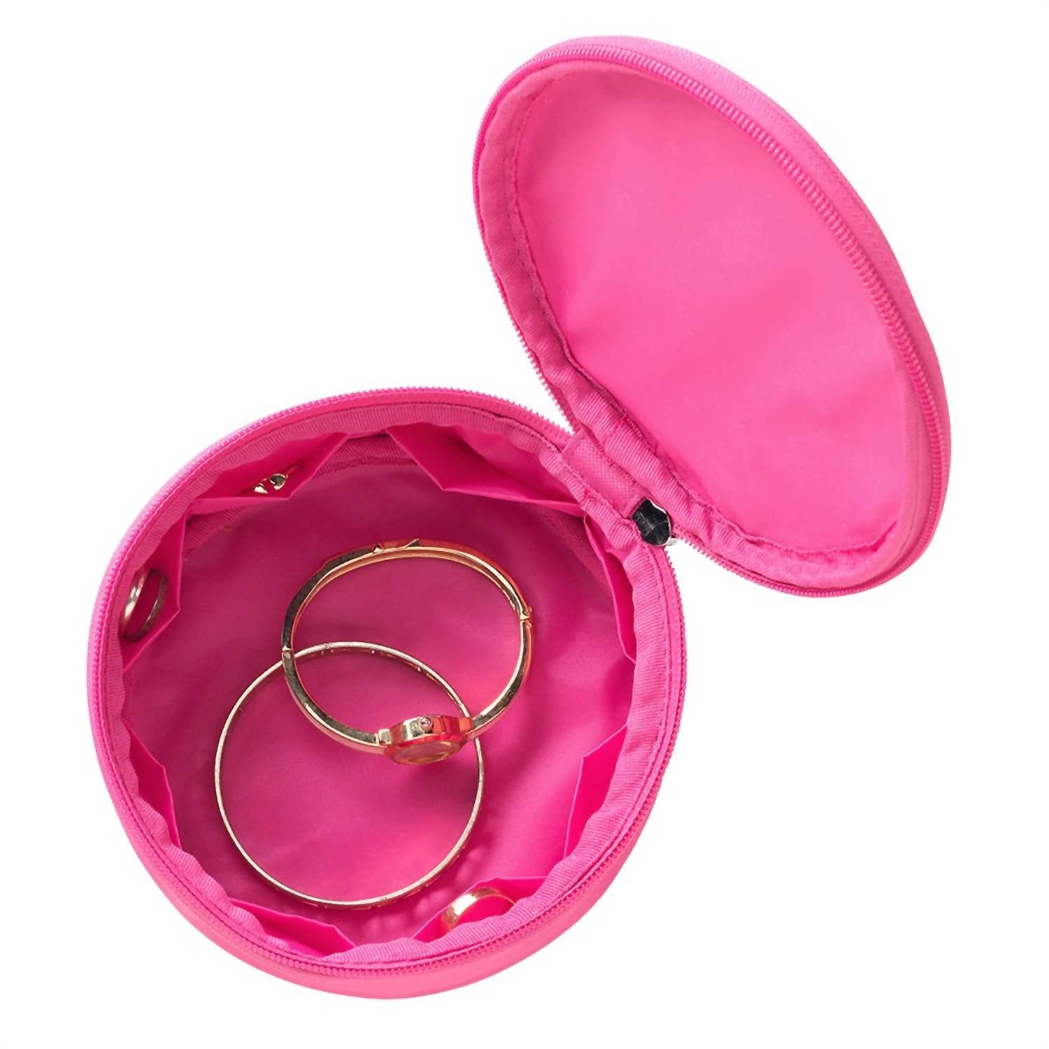 This Jewelry Case is made from durable polyester and features a zipper closure for secure storage. With a 3” height and 6” diameter, it includes 8 mini interior pockets for organized jewelry storage.