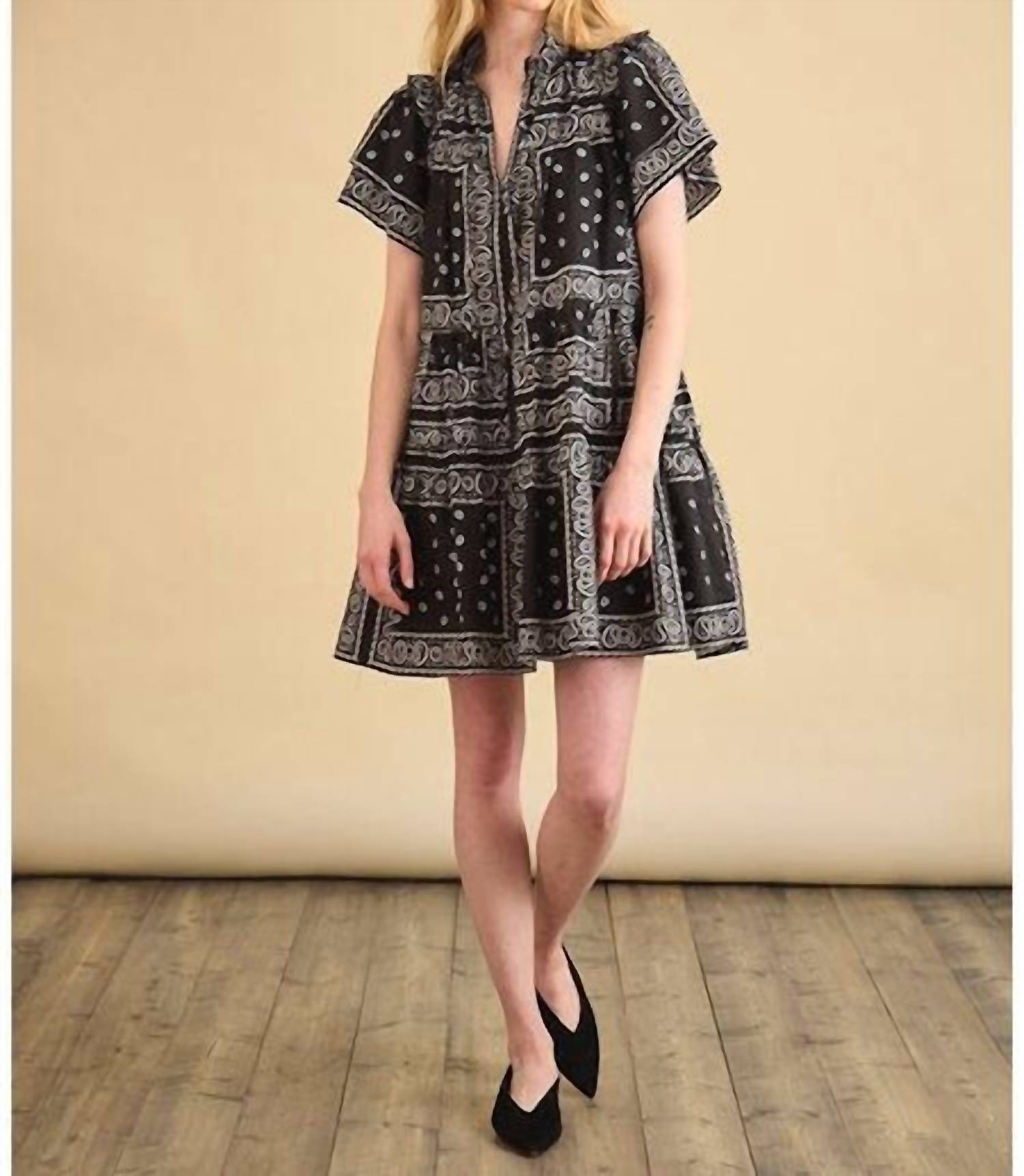 A short and breezy dress for those warmer days. Introducing the Merritt Bandana Print Mini Dress by Hunter Bell, perfect for a summer cocktail party with its chic A-line silhouette. This mini dress in Aces Wild Black features short tiered flutter sleeves and a ruffled crew neckline with ties. Crafted from 100% cotton poplin with a 35" length, it includes practical side seam pockets and a button closure. Care: Dry clean only.