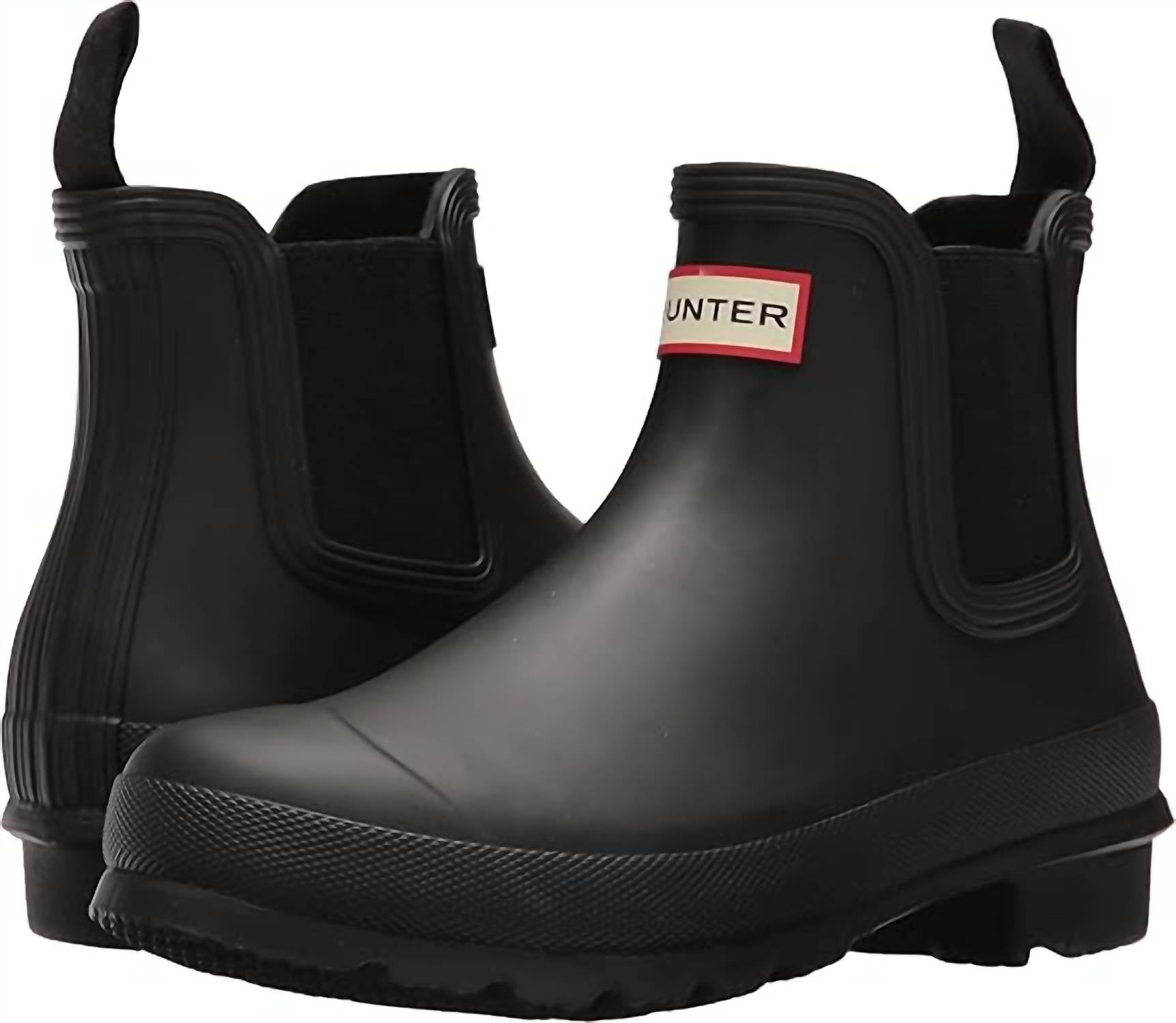 You'll be wishing for rainy days with these stylish yet functional rainboots. Meet the Women's Original Chelsea Rain Boots by Hunter Bell, the perfect blend of functionality and style. Tailored for vacation-ready fashion, these boots showcase a sleek monochrome black finish with a round toe. Boasting a low block heel ranging from 1 1/4" to 2", they're designed for comfort and style during those rainy spring days. Ideal for adult women, this footwear effortlessly combines practicality with on-trend design.