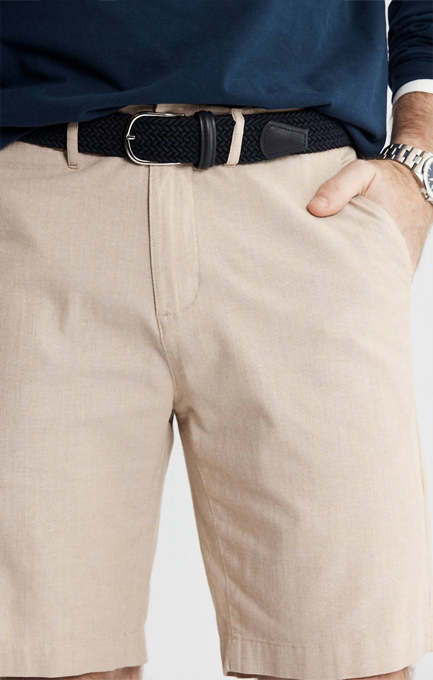 Embrace effortless style with the Stretch Chambray Short by JACHS NEW YORK, crafted in a breathable 98% cotton and 2% spandex blend. Designed in a soothing hue, this piece features a 9-inch inseam and a comfortable Bleecker Fit perfect for summer adventures. It comes with a button closure and practical pockets, making it an ideal choice for vacations or casual outings. This textured hybrid essential is imported and aligns with a preppy trend, perfectly suited for your seasonal wardrobe.