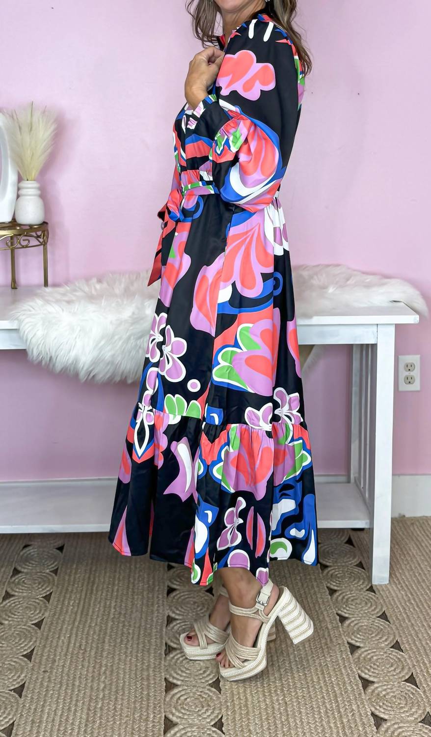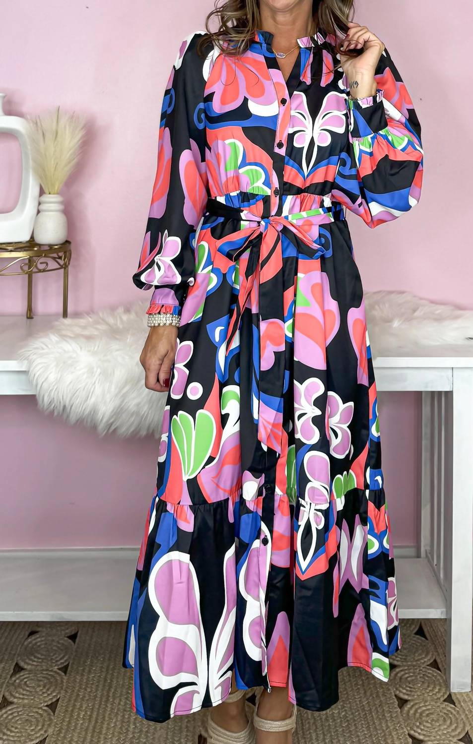 Style this maxi with your favorite statement necklace and sandals for the perfect look. Introducing the It's No Surprise Abstract Midi Dress by Jodifl, a stunning black multi-color piece designed to turn heads. This dress features long sleeves and an effortlessly chic belted waist, with a flattering collar neckline and button closure. Crafted from 100% polyester, it offers a perfect blend of style and comfort. Care: Machine wash. Available in sizes S(42" bust) to XL(48" bust), this A-line silhouette is ideal for spring occasions, like Easter or church events.