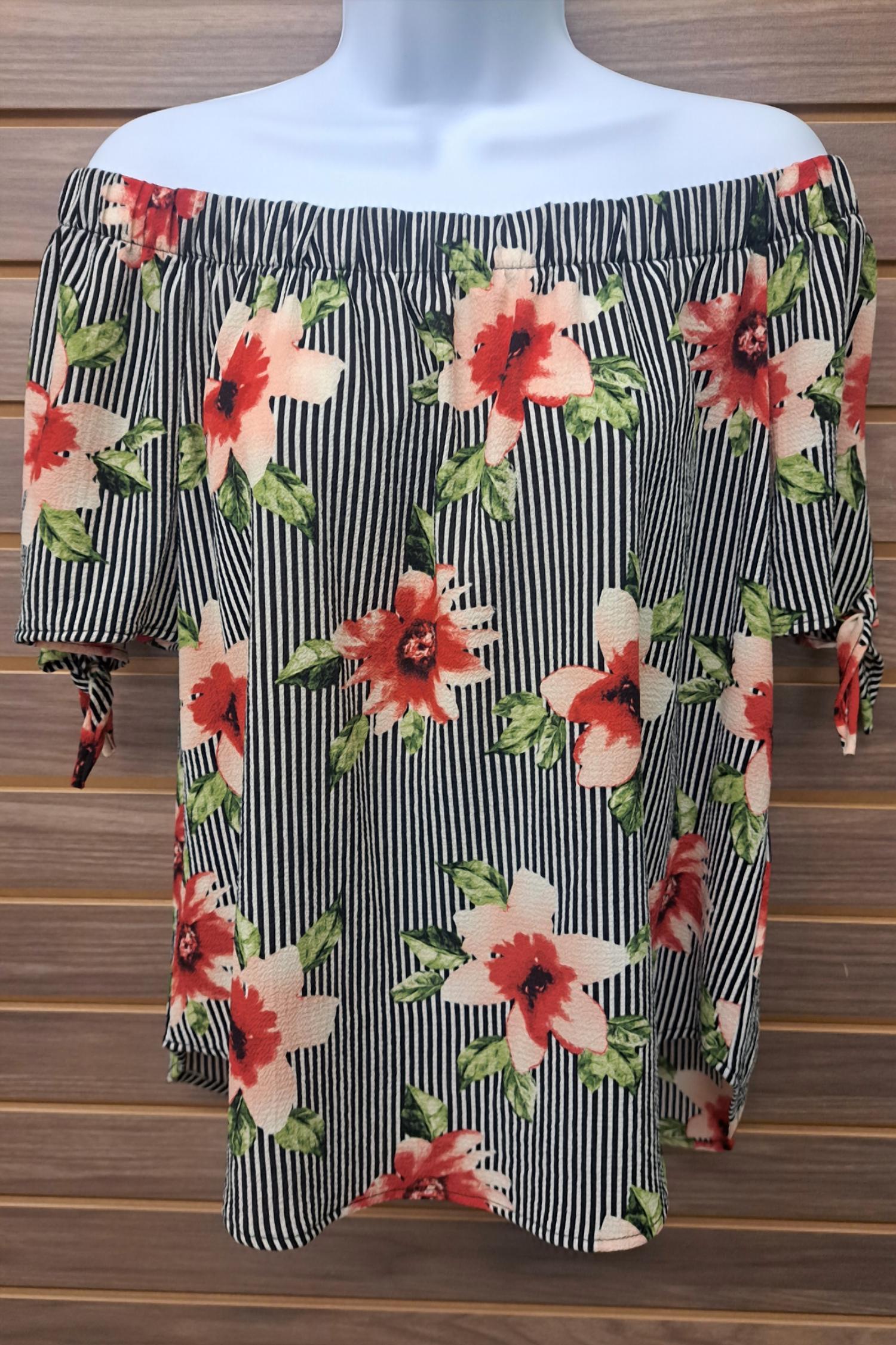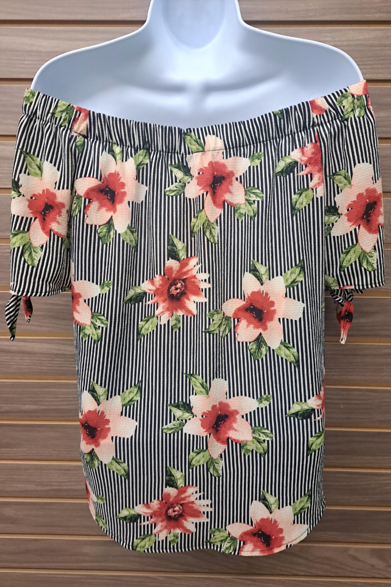 A timeless blouse that will never go out of style. Elevate your summer wardrobe with the Women's Floral Stripe Off Shoulder Tie Sleeve by Jodifl. This short sleeve blouse features a chic off-the-shoulder neckline and adjustable tie sleeves for a flirty, feminine look. Crafted from a breathable 96% rayon and 4% spandex blend, it ensures comfort and style for any vacation occasion. The pull-on closure adds ease to its elegant design, perfectly showcasing the black floral stripe pattern.