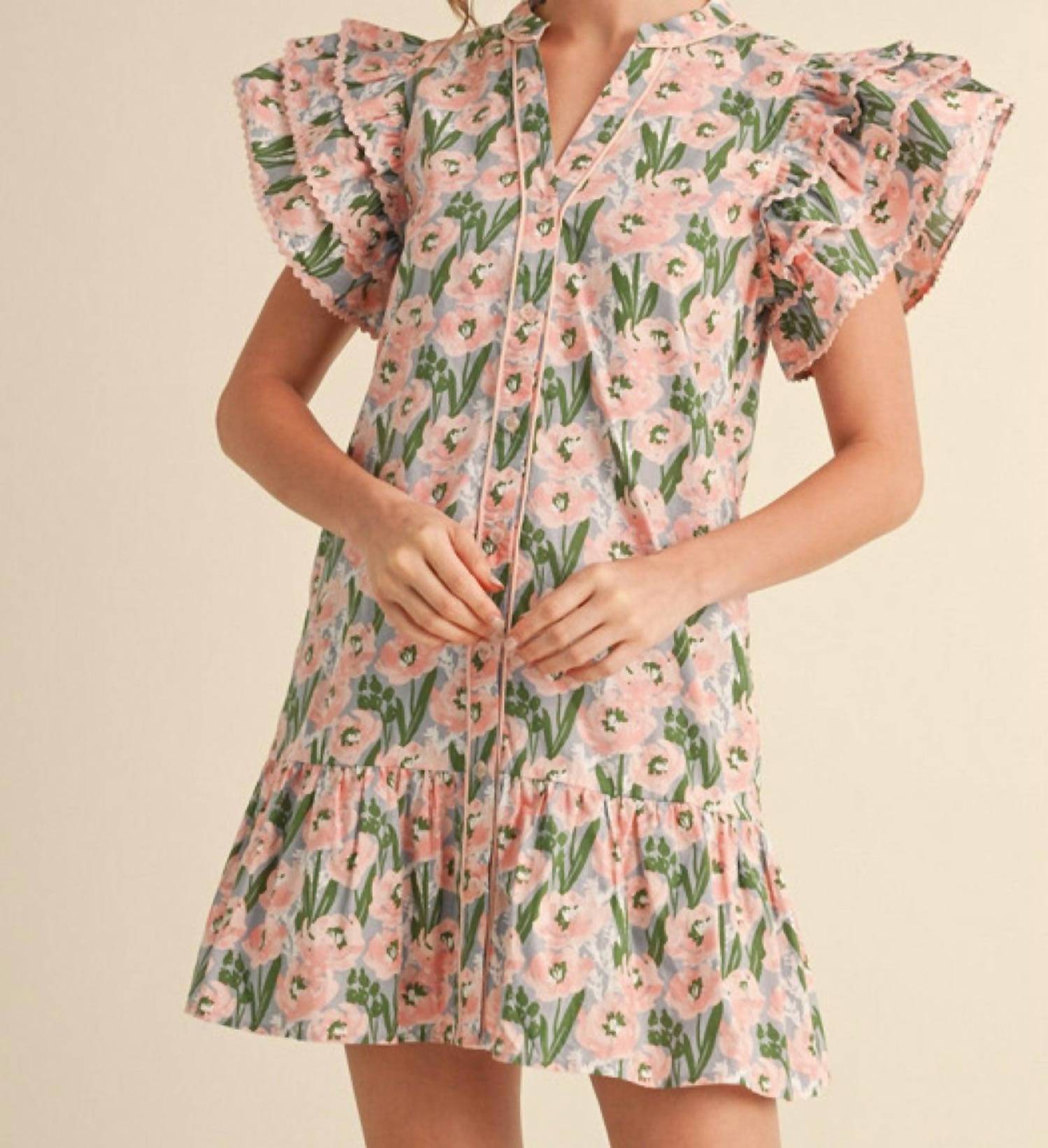 Comfortable and cute, this casual day dress has it all. Elevate your summer wardrobe with the Vintage Petals Floral Dress by Jodifl, an apricot pink beauty featuring a charming floral pattern. This casual dress showcases short sleeves and a shift silhouette, complete with a split V-neckline and a frilled mock collar. Crafted from 100% cotton, it includes practical side pockets and a button closure for ease of wear. Care is simple with machine wash instructions, making it perfect for birthday celebrations and other casual occasions.