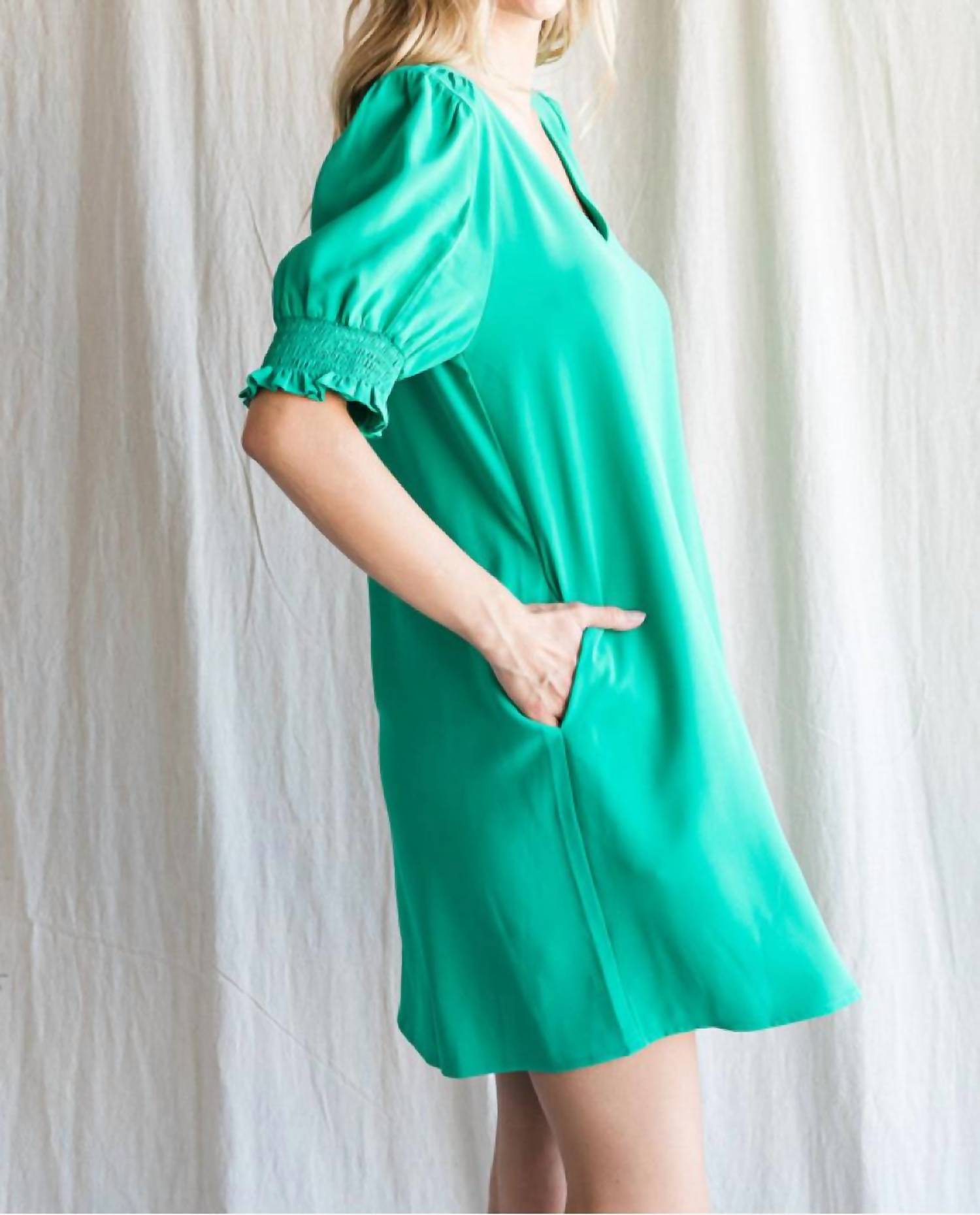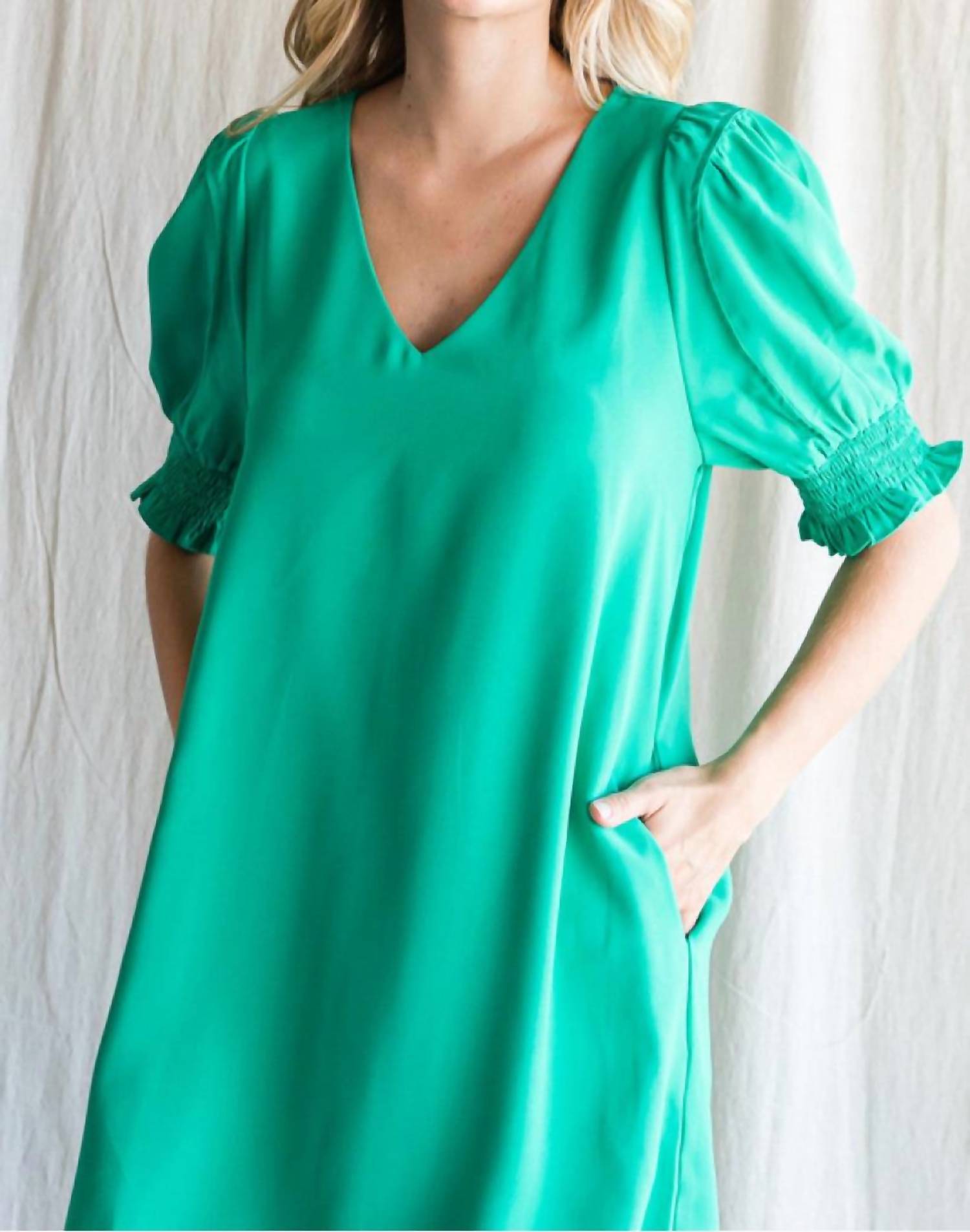The perfect mini dress for those warmer months. Discover the Jodifl Women's Leighton Shift Dress in a soft emerald hue, perfect for a minimalist summer look. This A-line mini dress features short, puffed sleeves with smocked cuffs and a V-neck, making it ideal for a beach day. Made from 100% polyester, it is non-sheer, unlined, and lightweight, with convenient side pockets. Closure: Pull on. Care: Hand wash.