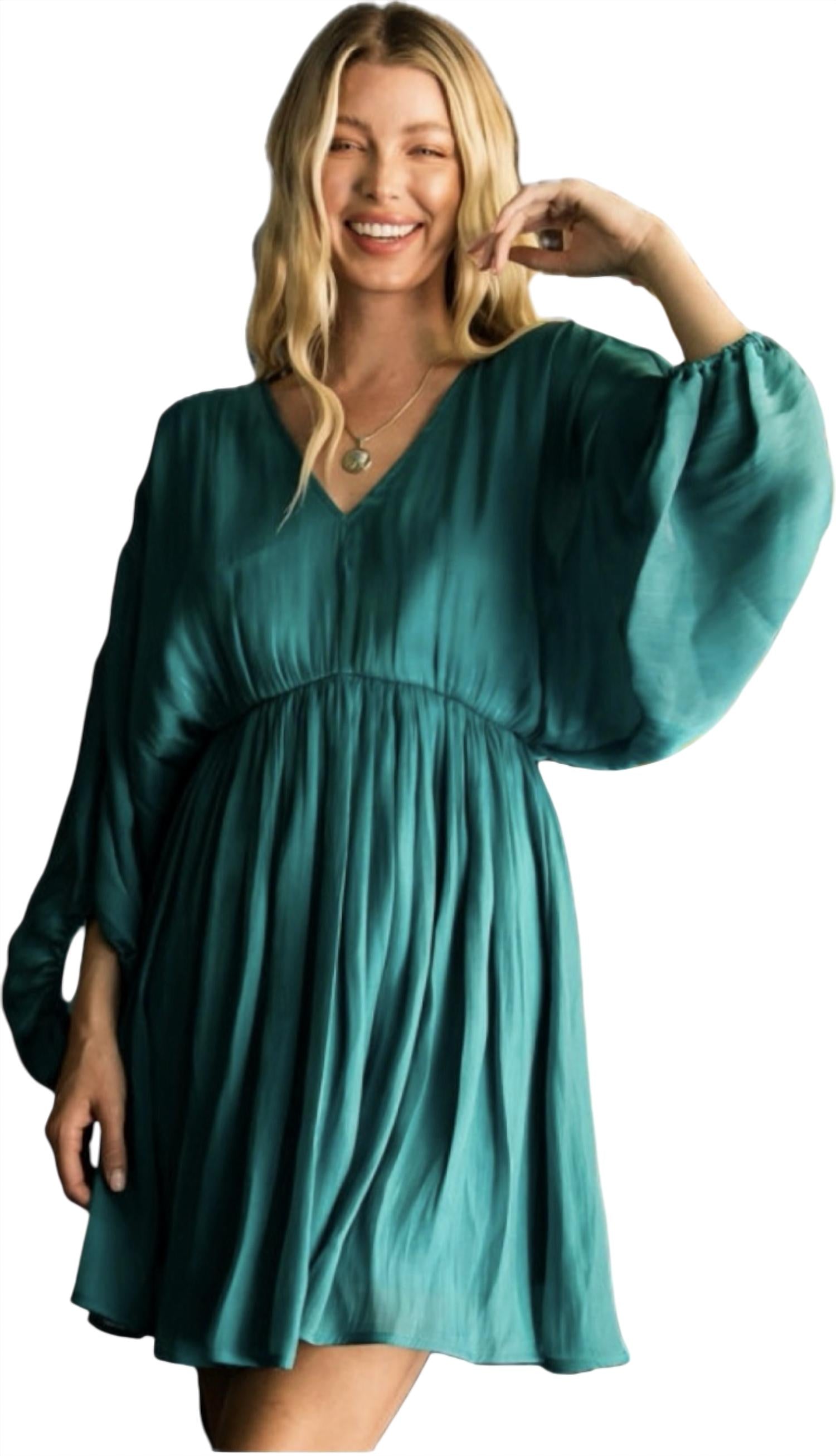 A short and breezy dress for those warmer days. Make a statement with the Metallic Shine Mini Dress by Jodifl, featuring an elegant emerald hue and a captivating metallic shine finish. This dress boasts dolman long sleeves and a stylish front to back V-neckline, accentuated by a supportive back tie. Crafted from high-quality polyester, it offers a sophisticated fit and flare silhouette perfect for any occasion. This design is to ensure a comfortable and flattering fit.