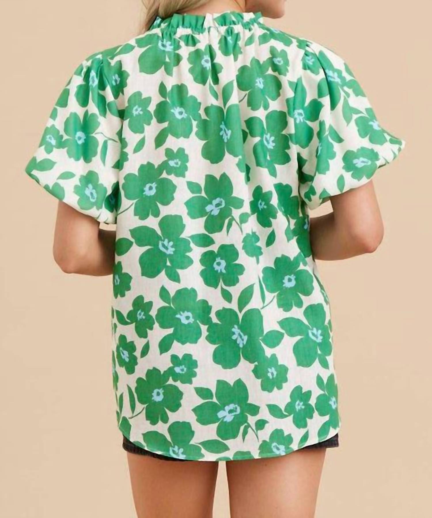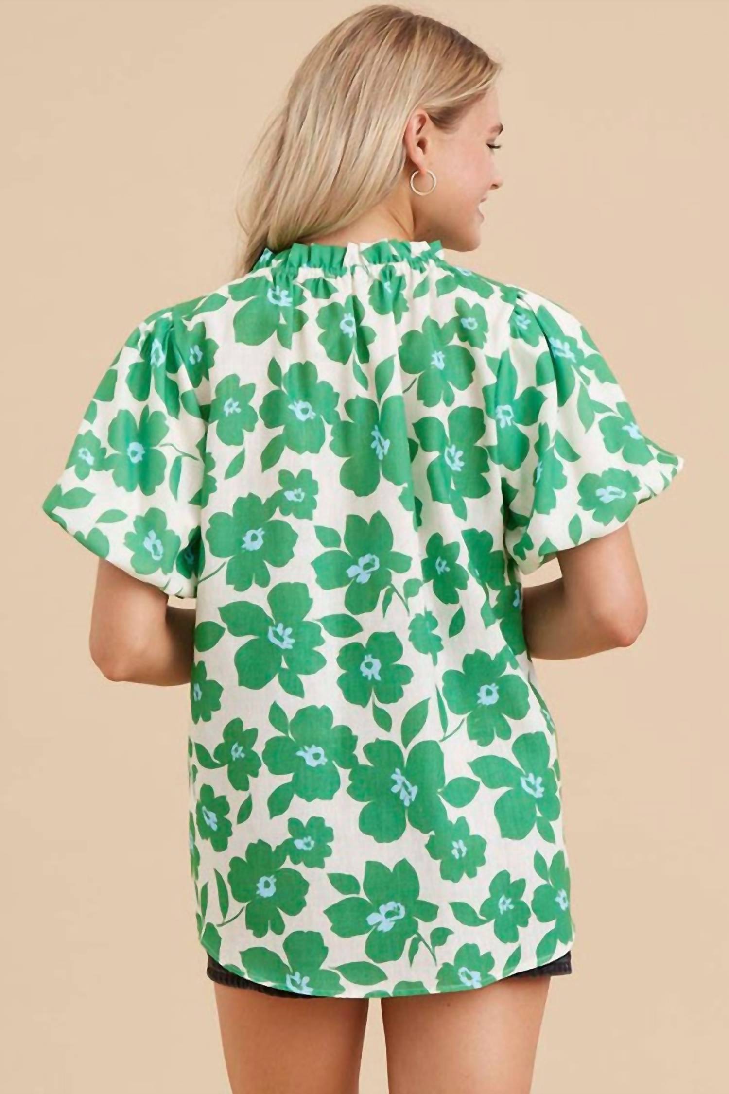 Pair this with your favorite jeans and slides for your next girls night out. Embrace timeless elegance with the Simple Moments Top by Jodifl, showcasing a charming green and blue floral pattern. This blouse features short puffed sleeves and a stylish, adjustable frilled neck, making it suitable for both dressy and casual occasions. Crafted from 100% polyester, it offers a lightweight feel that’s perfect for spring outings. Closure type: Pull on. Ideal for holiday parties or celebrating St. Patrick’s Day in style. Model is 5'6" and wearing a size small.