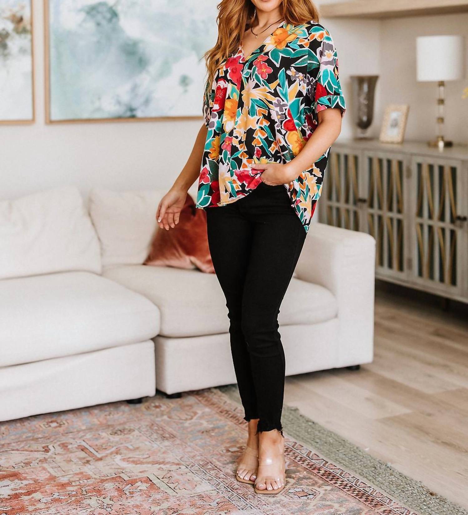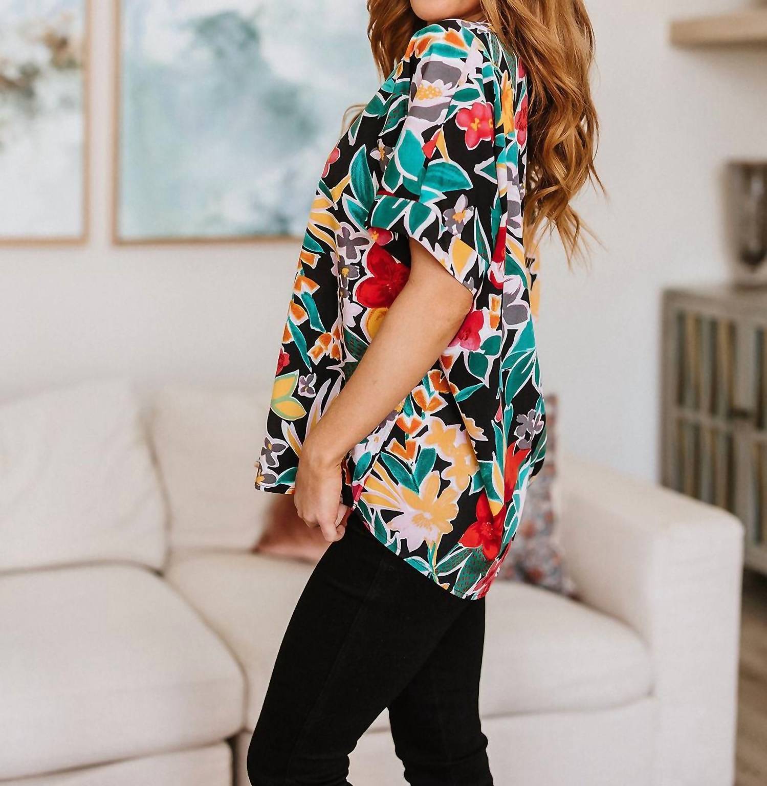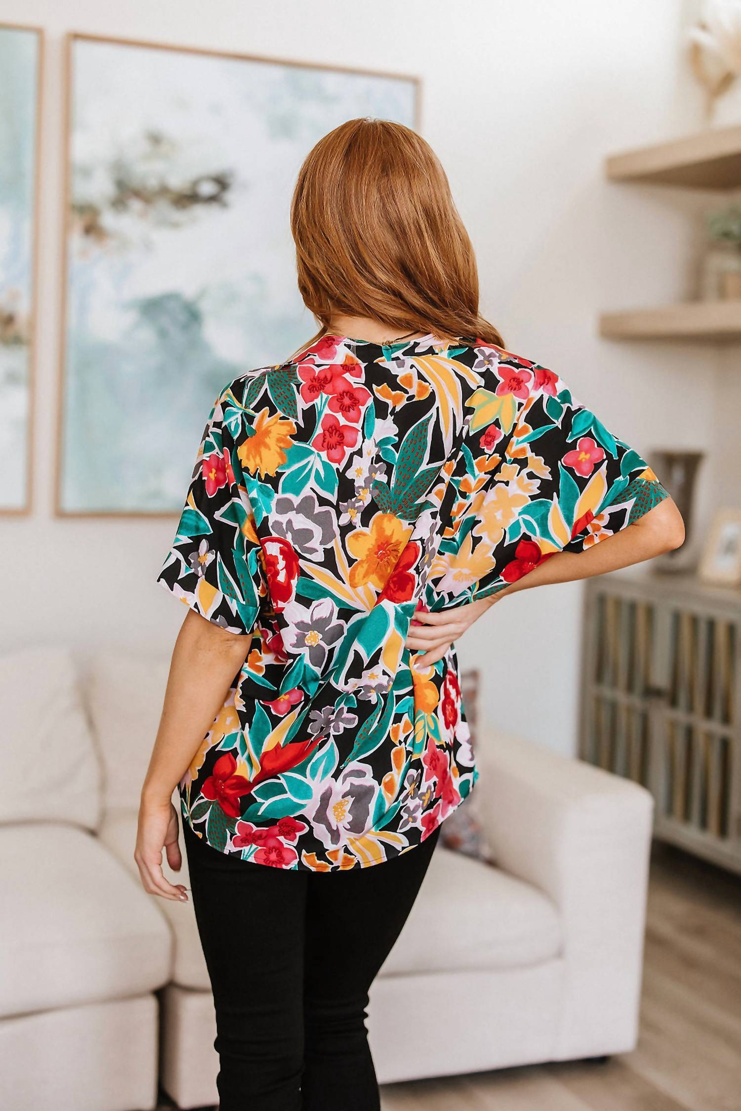 Dolman sleeves. Oversized silhouette. Floral pattern. Woven Fabric. V-Neckline. Comfort Fit. 100% Polyester. True to Size.