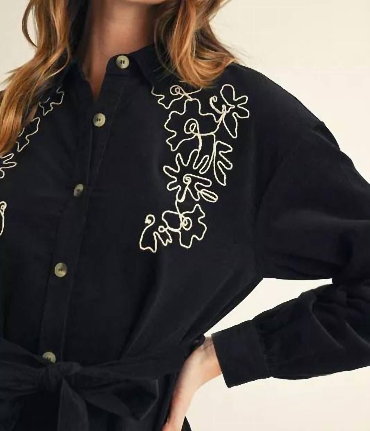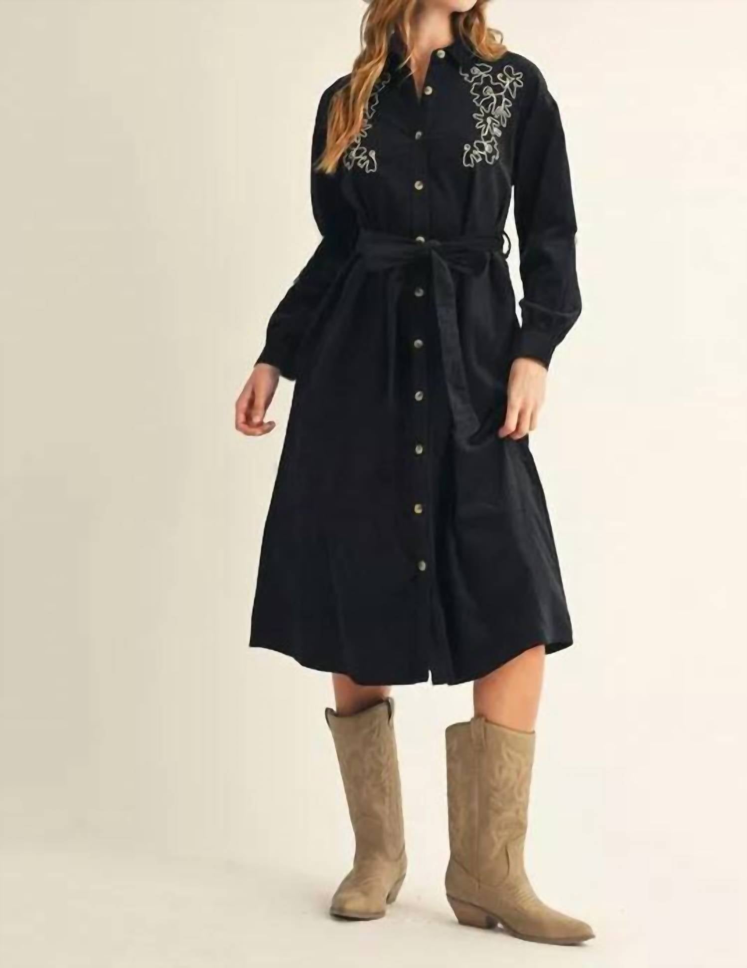 The perfect length dress does exist. Embrace elegance with the Bridgette Cord Dress by Jodifl, ideal for your next dinner party. This black midi wrap dress features long roll-up sleeves, a classic button closure, and is crafted from 100% cotton for a comfortable fit. Its 3D floral pattern and functional side pockets add a touch of practicality and charm, while a waist tie cinches the silhouette perfectly. Model is 5'9'' and wearing a size Small.