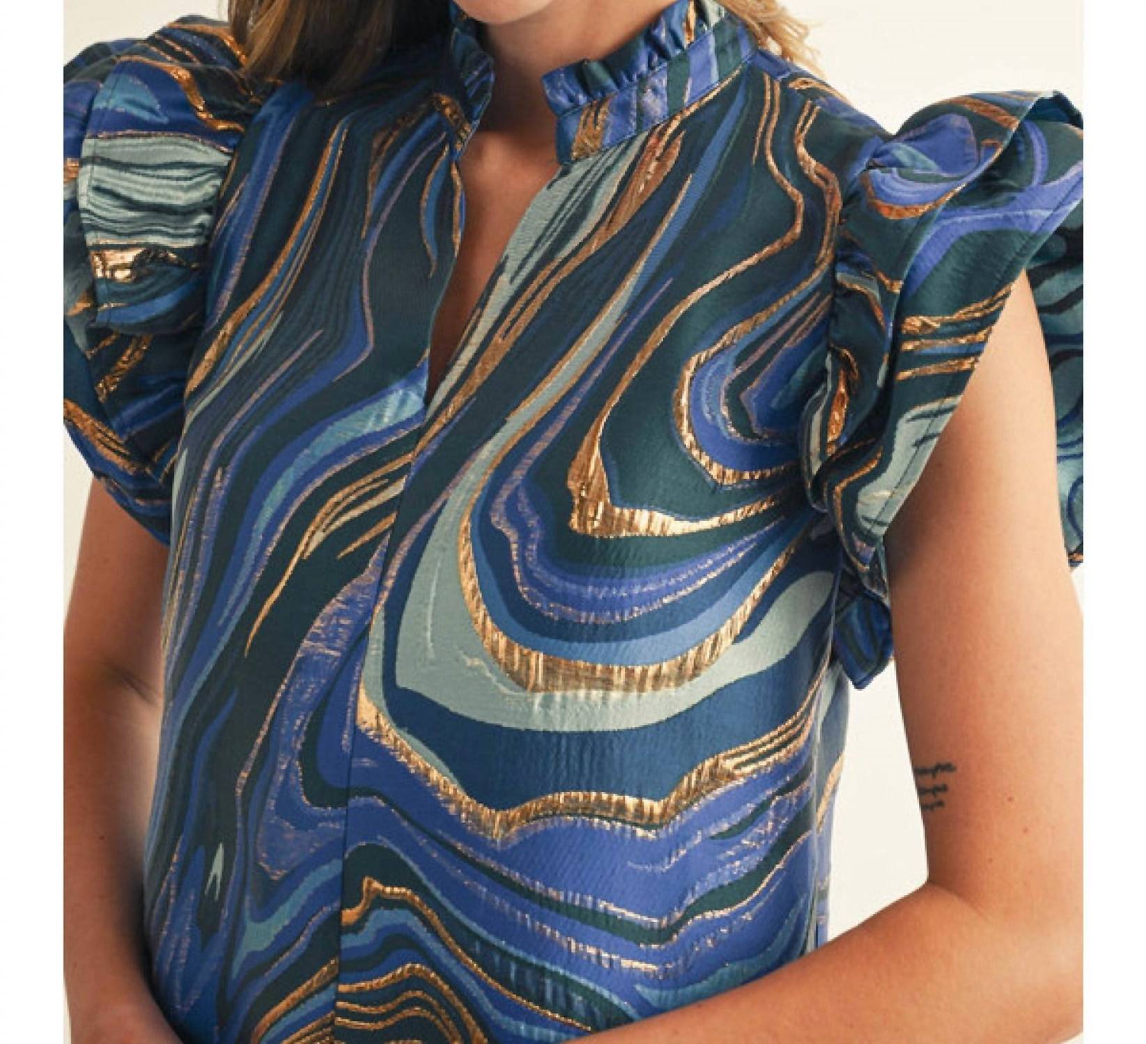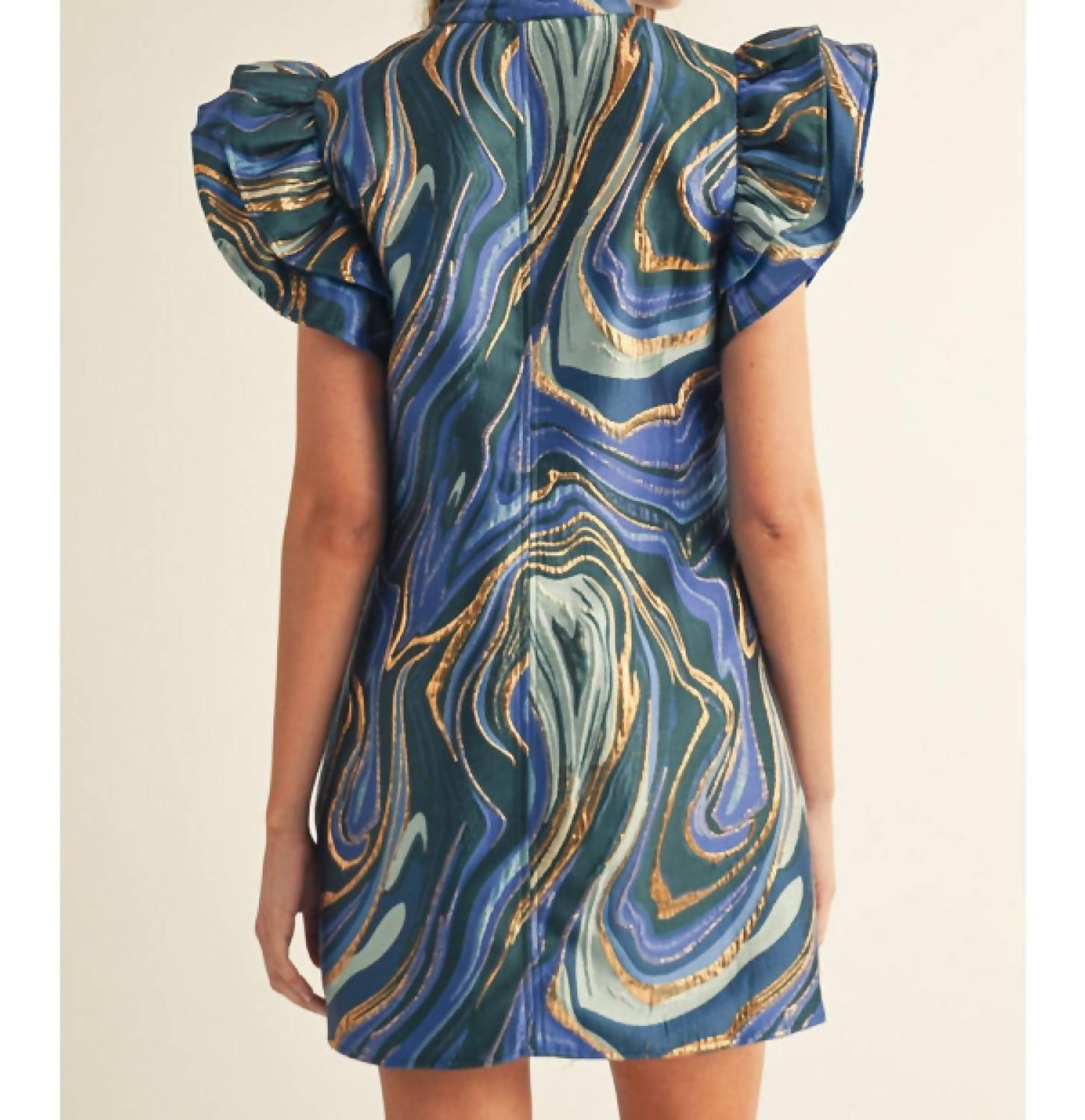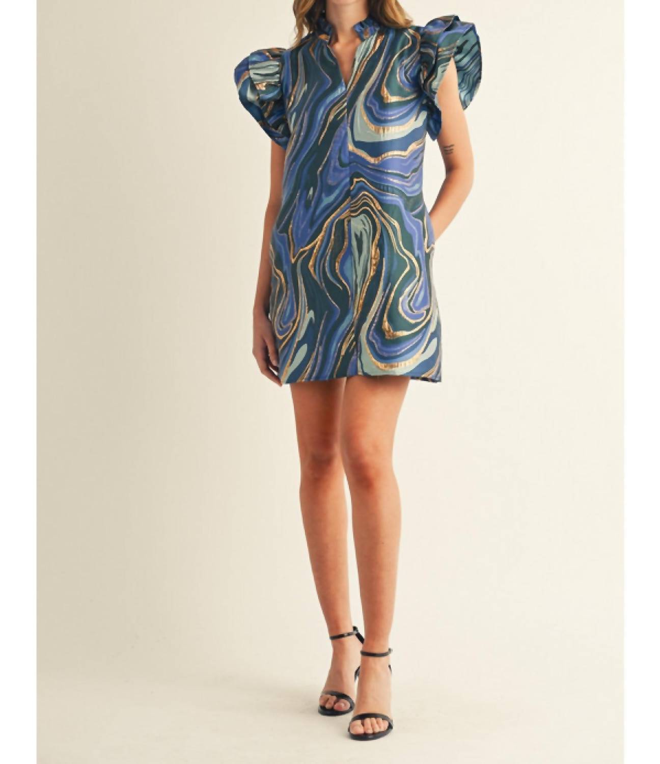 The kind of easy and flattering dress you'll be reaching for all season long. The Isla Mini Dress by Jodifl is a vibrant addition to any wardrobe, showcasing short layered ruffled sleeves and a feminine ruffled neckline. Made from 100% polyester in a striking royal mix abstract jacquard with lurex, this dress sparkles subtly, offering a relaxed and flattering silhouette. It features functional side pockets and a convenient pull-on closure. Versatile and comfortable, it's perfect for holiday parties or a Thanksgiving celebration. Model is 5'9" and wearing a size Small.