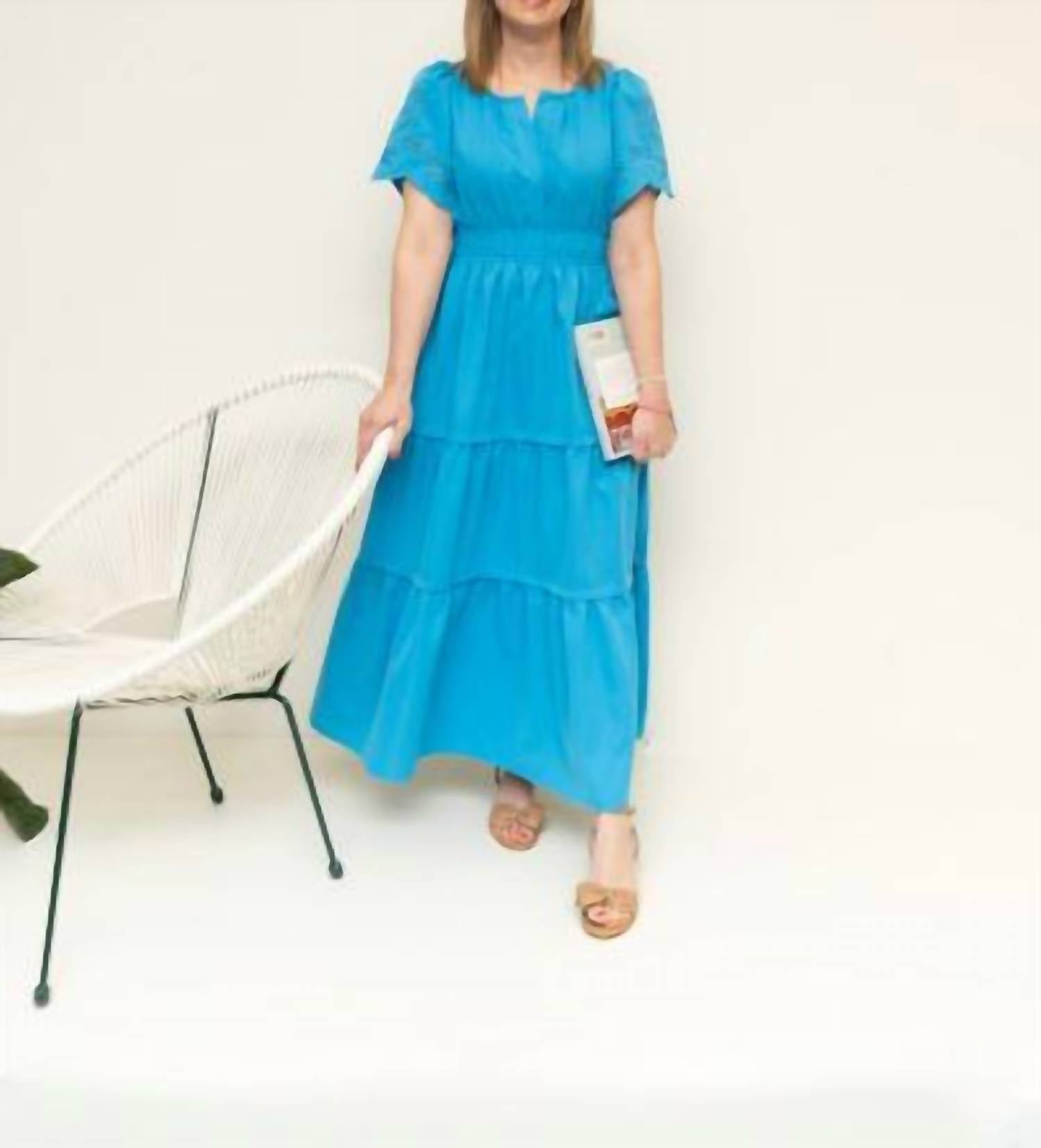A maxi dress that is just as cute as it is comfortable. Embrace the elegance of the Jayden Maxi Dress by Jodifl, perfect for your engagement occasion with its minimalist charm. Featuring puffed short sleeves with an embroidered cut-out edge, this dress is crafted from 100% polyester and boasts a tiered maxi length for a graceful flow. The smocked waistline and scoopneck add sophistication to the design, complemented by practical pockets. Designed for spring in a fresh turquoise blue, this A-line silhouette dress concludes with a convenient pull-on closure. Care instructions: Hand wash and lay flat to dry.