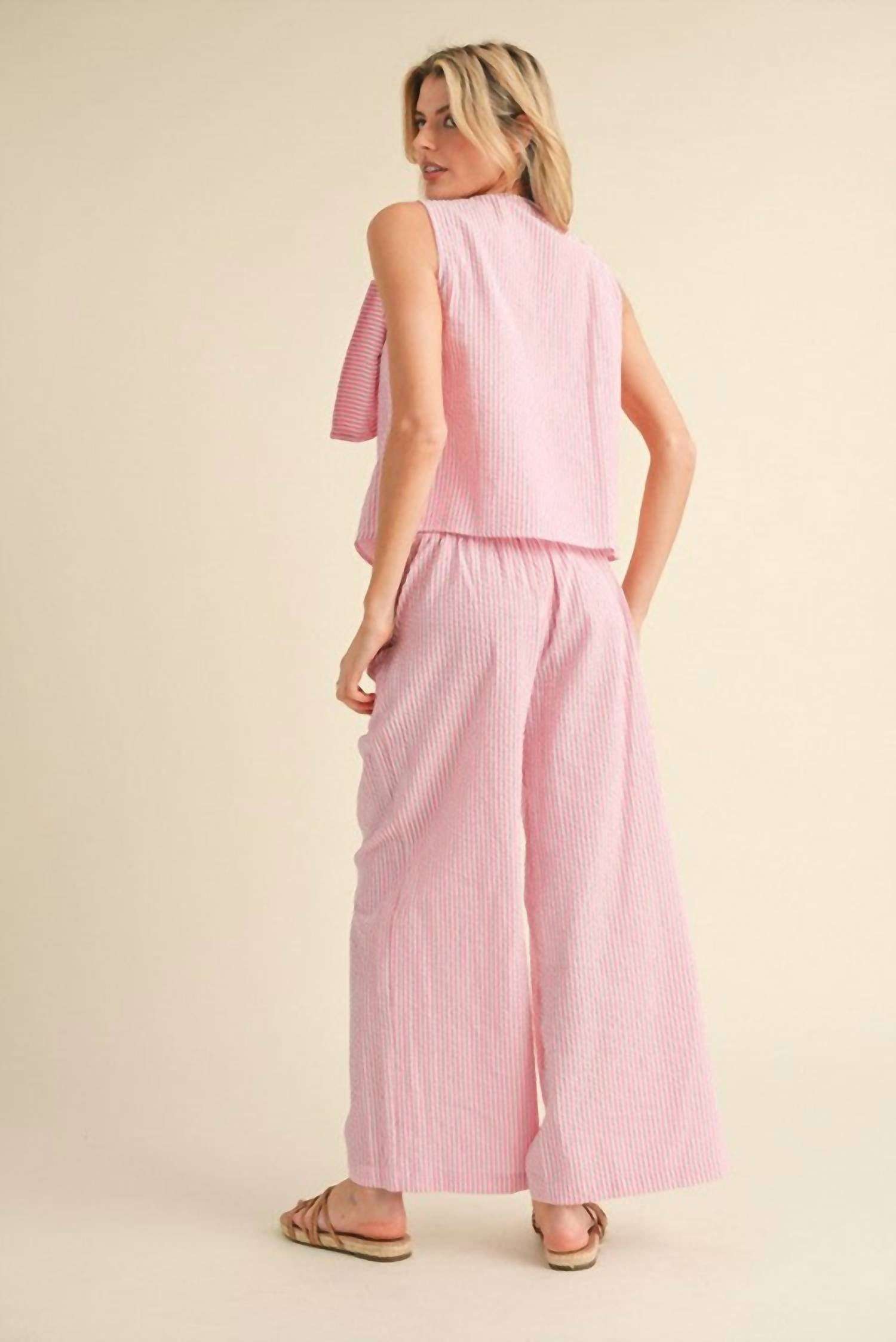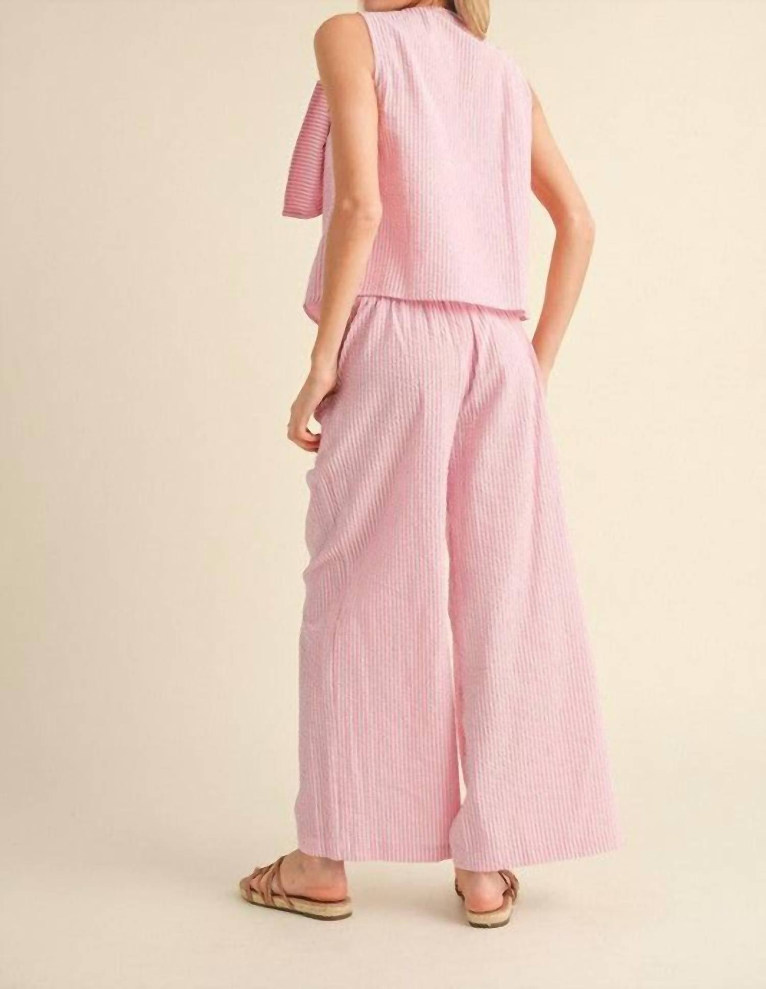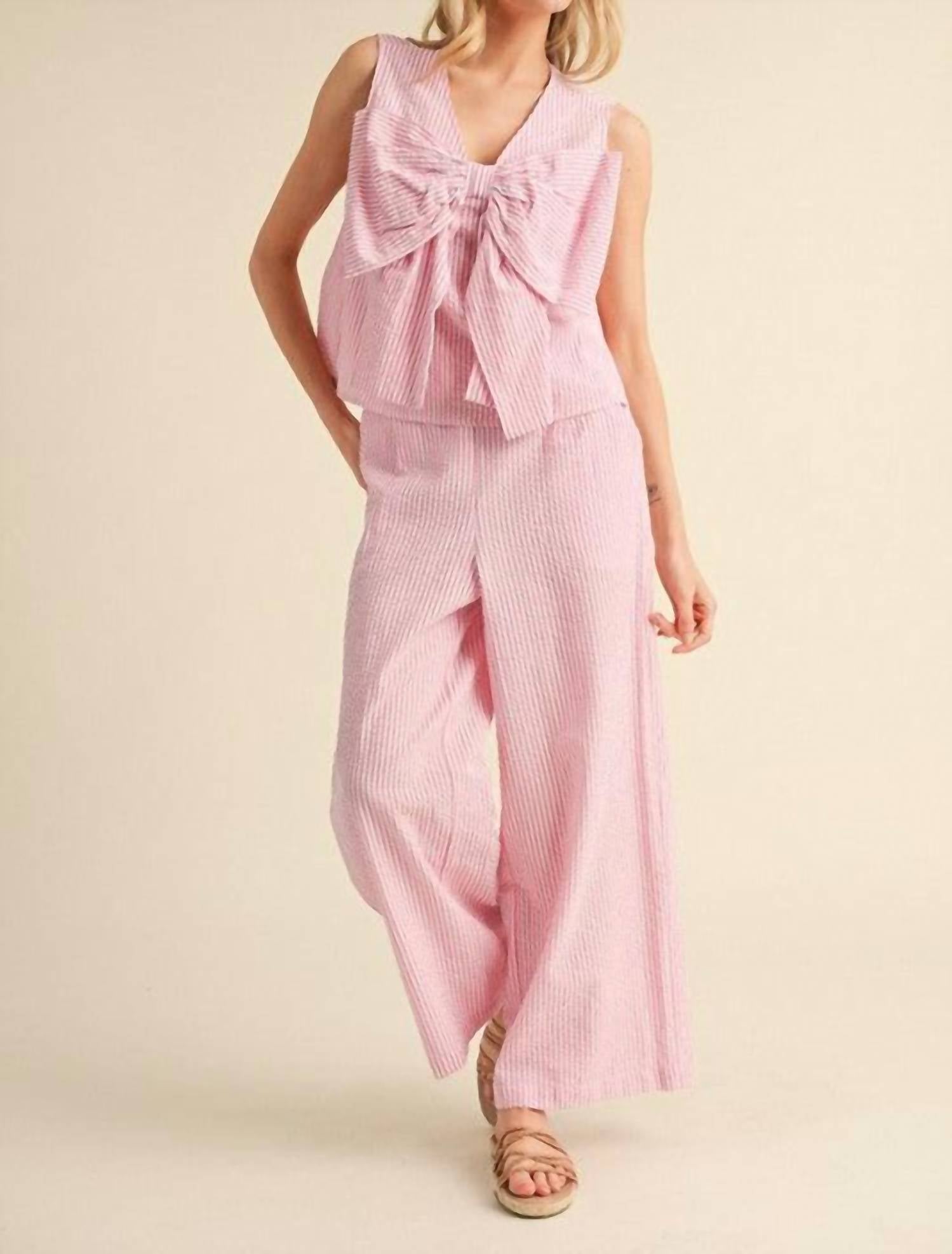 Loungewear doesn't have to be frumpy and this is exactly what we had in mind. Designed for a comfortable fit, this chic little number will be your favorite lounging-at-home look. Embrace playful charm with the Seersucker Striped Bow Set by Jodifl, perfect for summer adventures and casual vacations. This women's loungewear set in charming pink stripes features a sleeveless V-neck top with an eye-catching big bow detail, paired with pants that offer a stretch-band waistline and handy side pockets. Made from 100% cotton, it ensures a non-sheer, lightweight feel to keep you cool and comfortable. Care is effortless with machine wash instructions, making it ideal for any relaxed outing or Valentine's Day celebration.