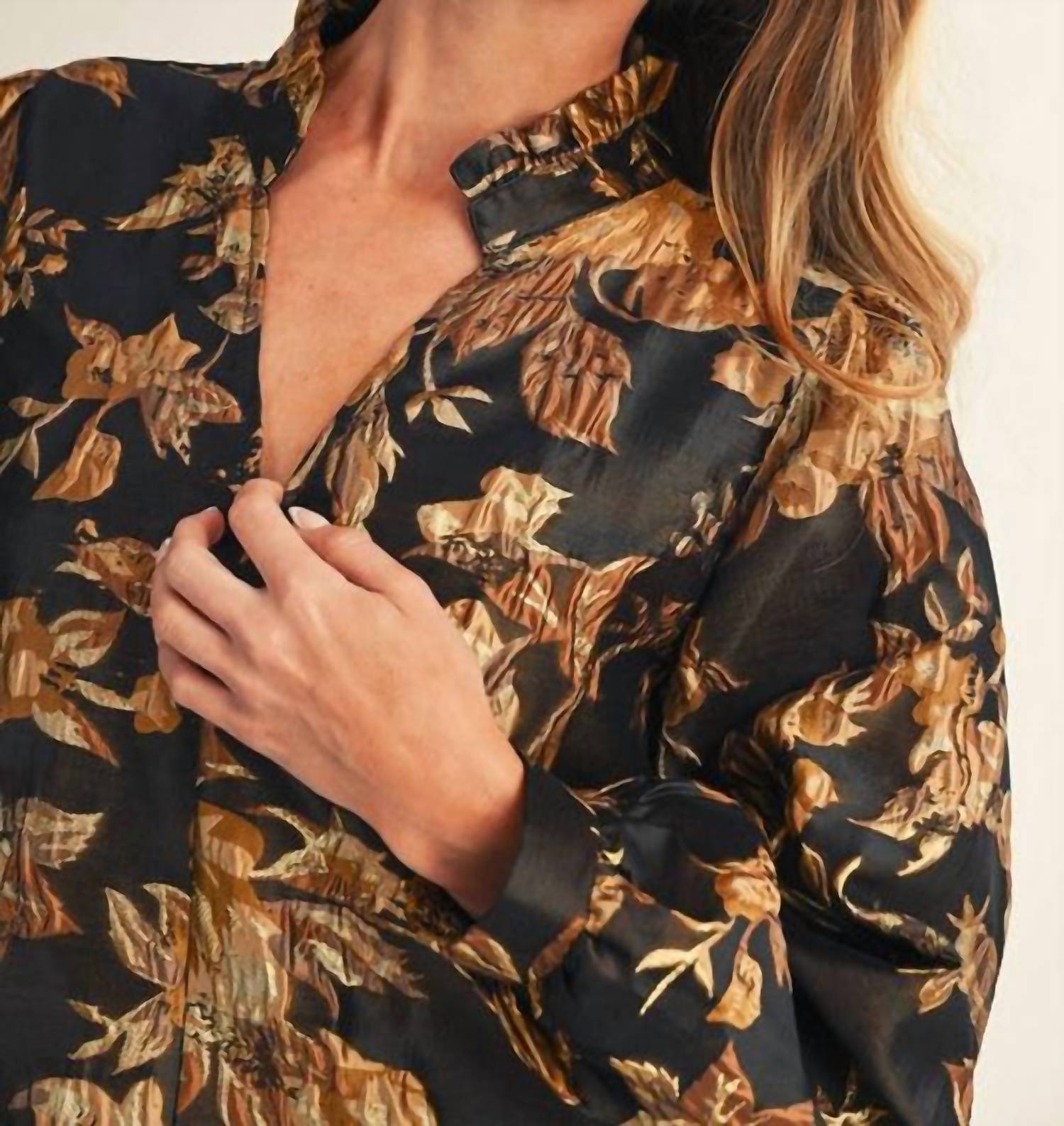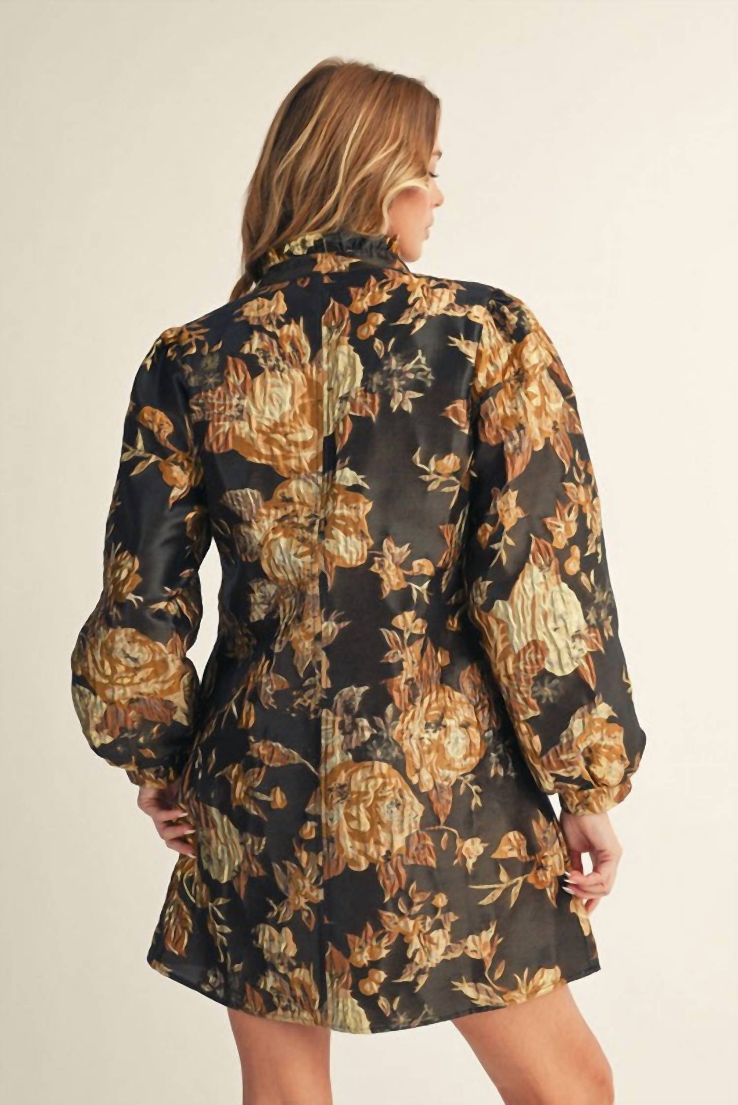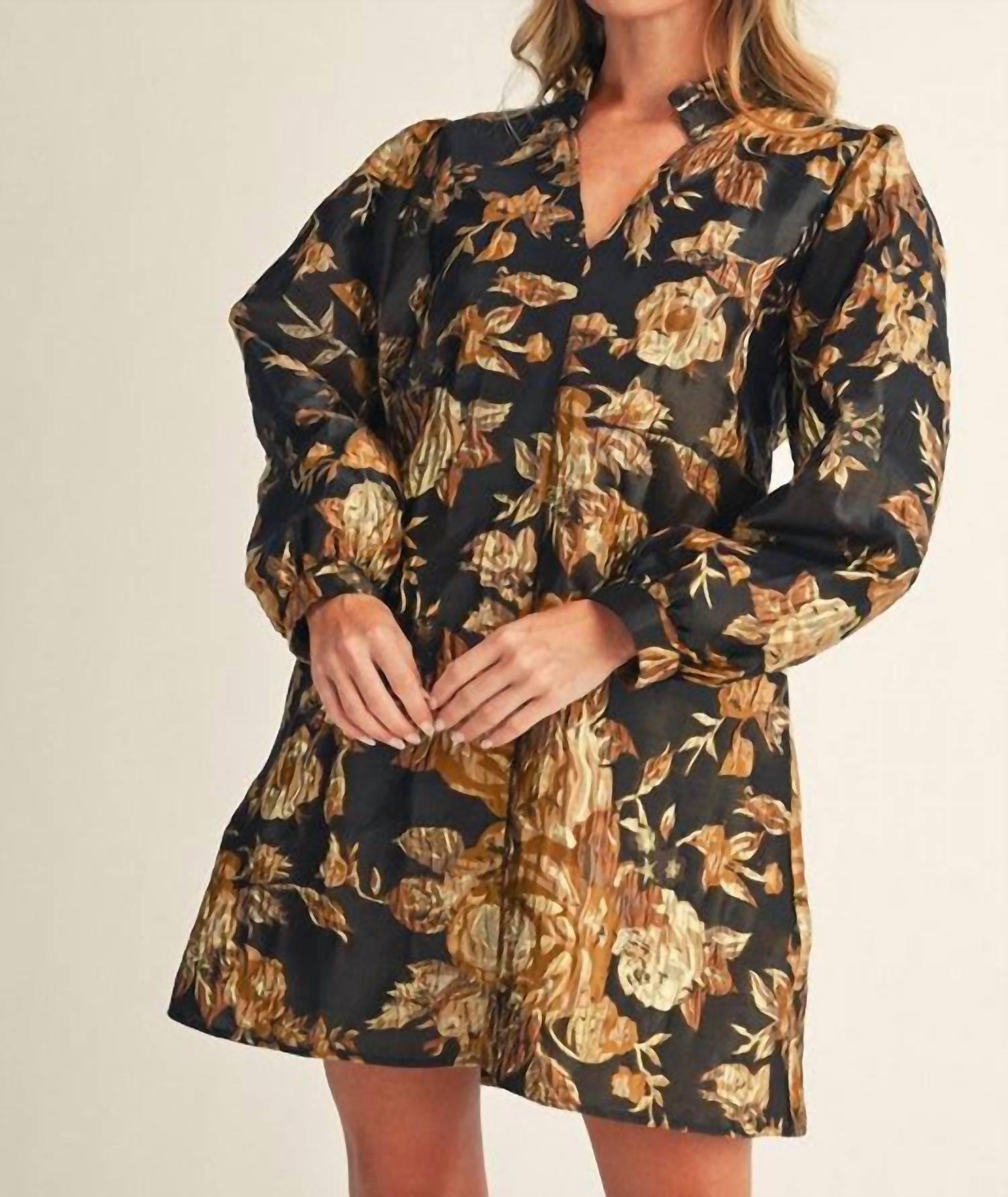 The kind of easy and flattering dress you'll be reaching for all season long. Introducing The Sienna Mini Dress by Jodifl, a stunning addition to your wardrobe that combines boho chic with elegant flair. With long sleeves and crafted from black, brown, and gold jacquard floral fabric, this A-line dress gives a shimmering allure suitable for Thanksgiving and holiday parties. Its composition includes 60% Polyester, 20% Lurex, and 20% Nylon, and features a comfortable babydoll silhouette with a pull-on closure. Ideal for seasonal gatherings, this dress embodies a blend of playful sophistication and effortless style.