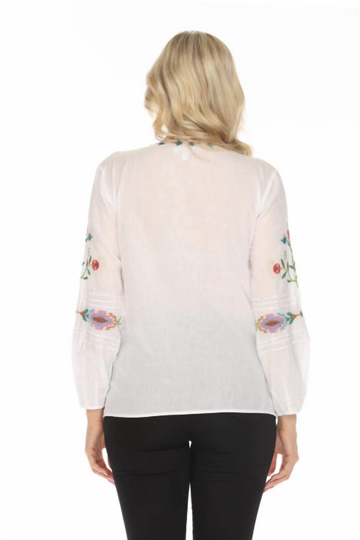 Pair this with your favorite jeans and slides for your next girls night out. Elevate your vacation wardrobe with the Women's Gabriella Blouse by Johnny Was in a breezy boho chic style. This floral-patterned blouse offers elegance with its long sleeves and V-neck, providing a balance of comfort and sophistication. Made for easy wear with a practical pull-on closure, it's perfect for a laid-back summer day. Whether you're on a beach getaway or a casual outing, this blouse promises effortless style.