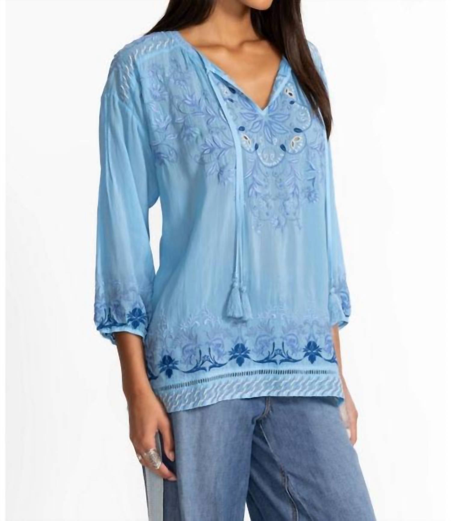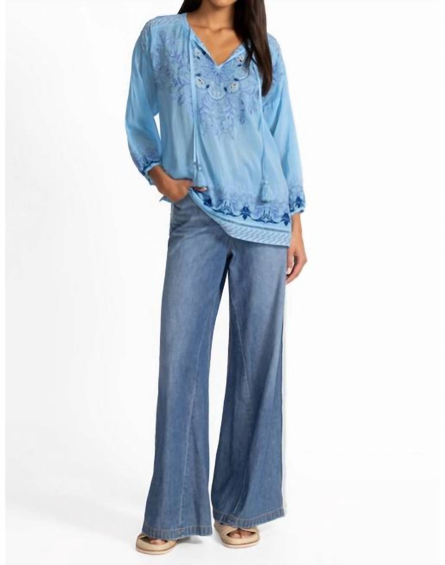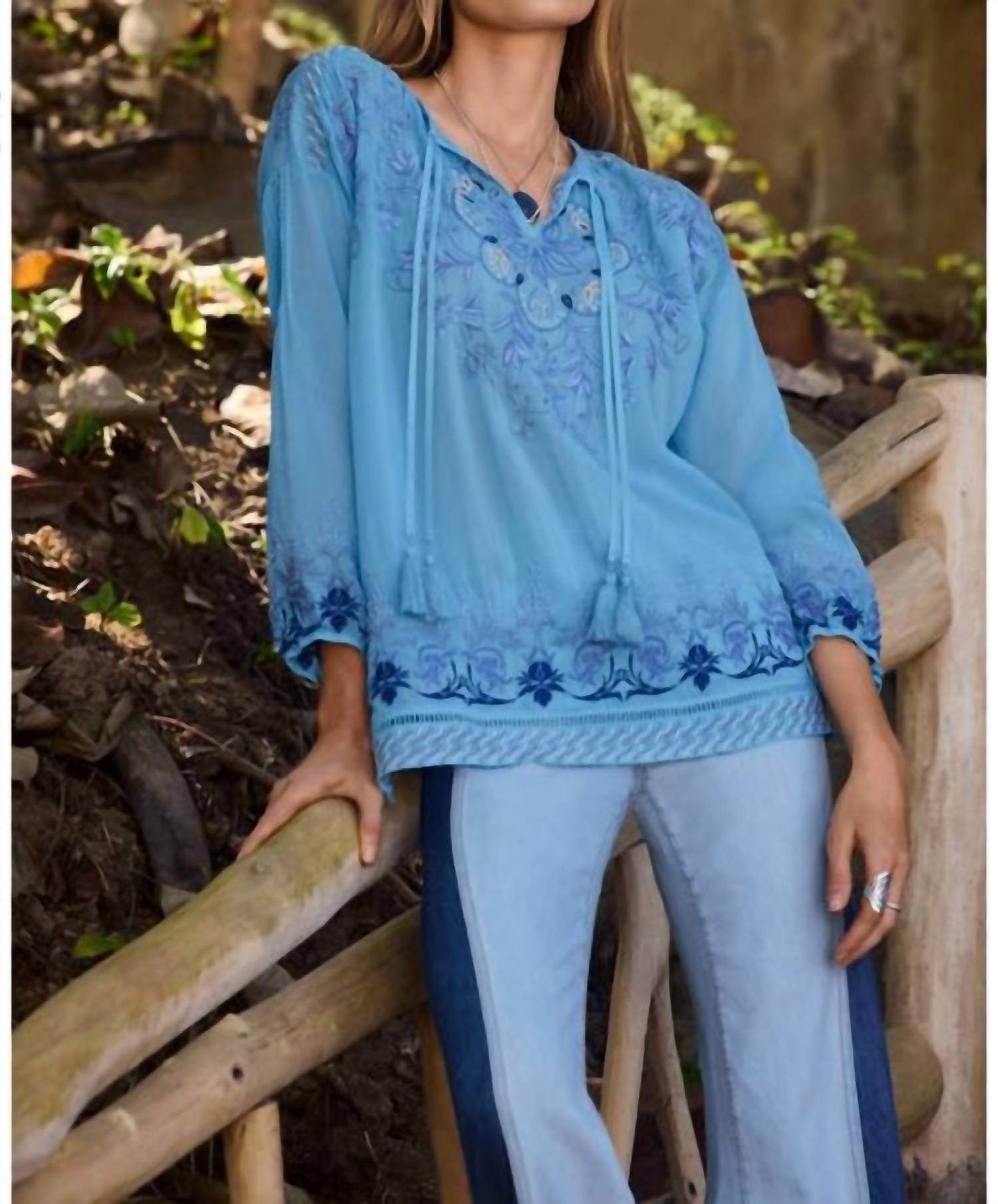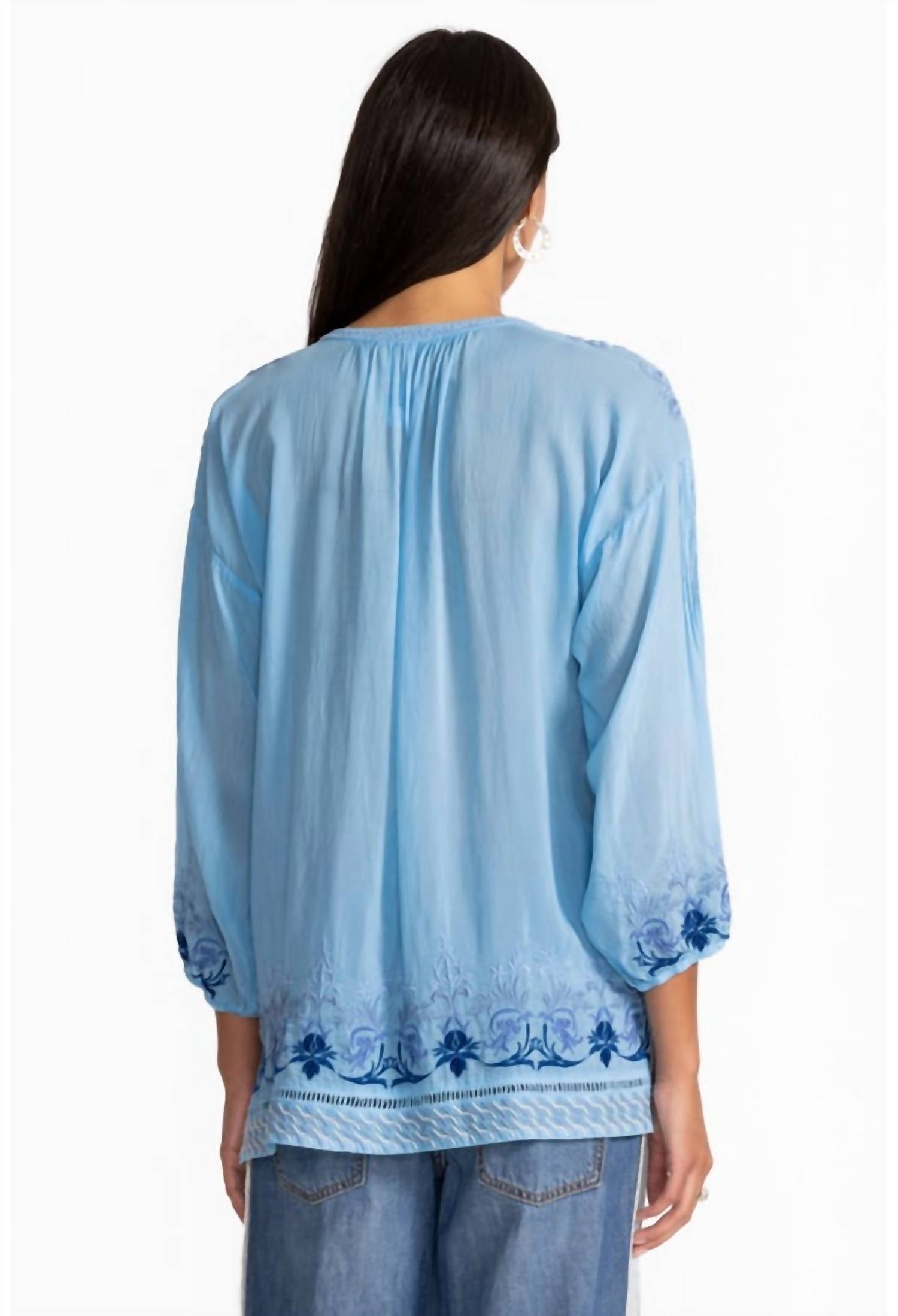 A versatile blouse that works from desk to dinner! Beautifully embroidered with an intricate floral pattern in hues of blue, the Margot Blouse is crafted from a light and airy, breathable fabric. Designed with a split V-neckline and delicate ties, it offers elastic cuffs and side slits for a relaxed fit. Pair it with dark wash denim and coordinating flats for a polished casual look. Hand Wash