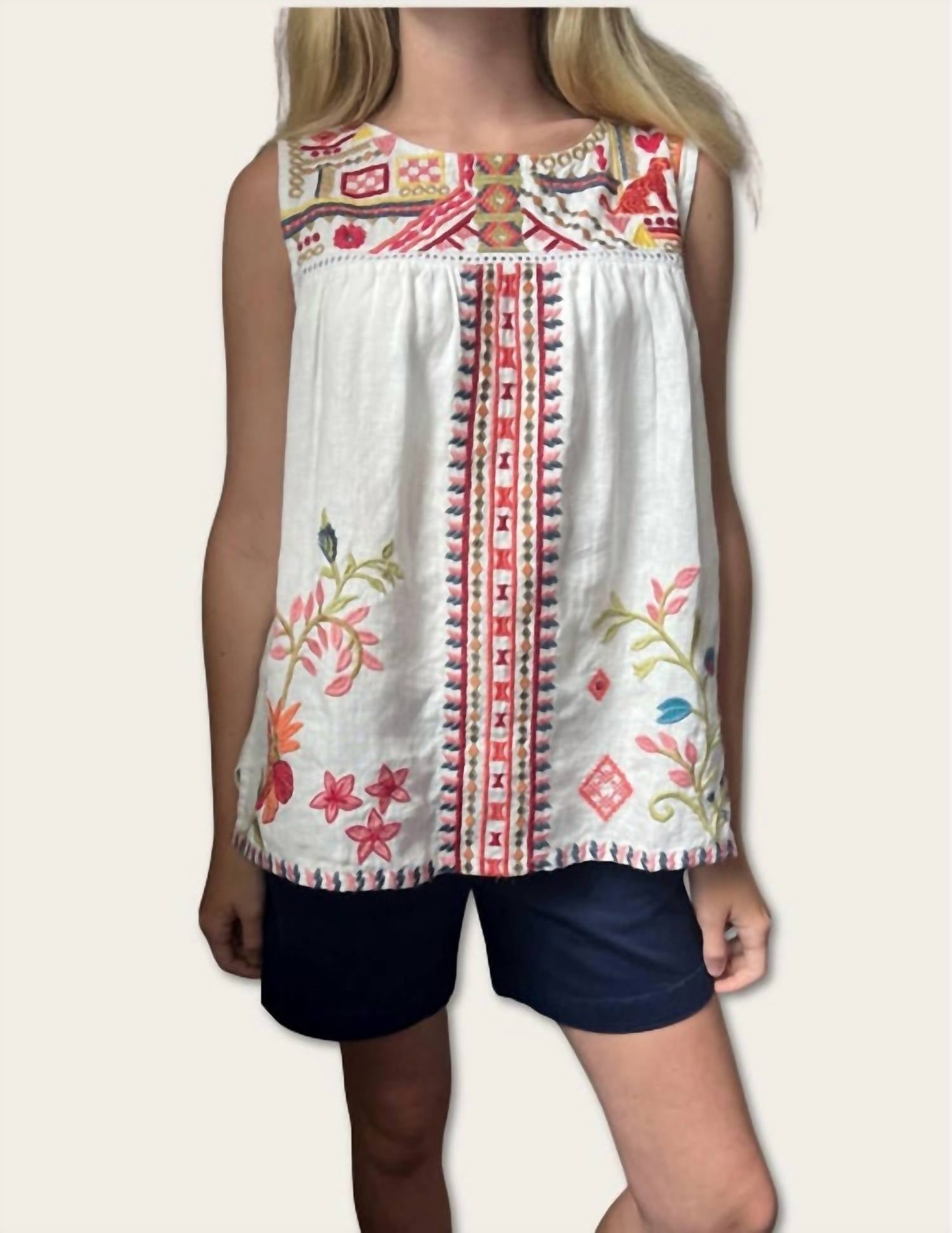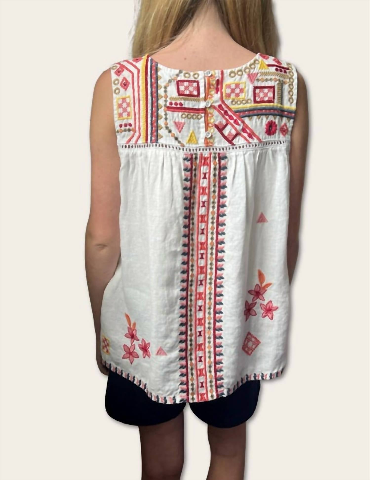This classic tank top is perfect for layering and cute enough to wear on its own. Crafted from 100% breathable linen, the Georgia Relaxed Tank features embroidered floral and geo design exemplified in intricate placement. Featuring a high neck and back, this breezy tank is finished with a boxy split hemline. Model is wearing size XS