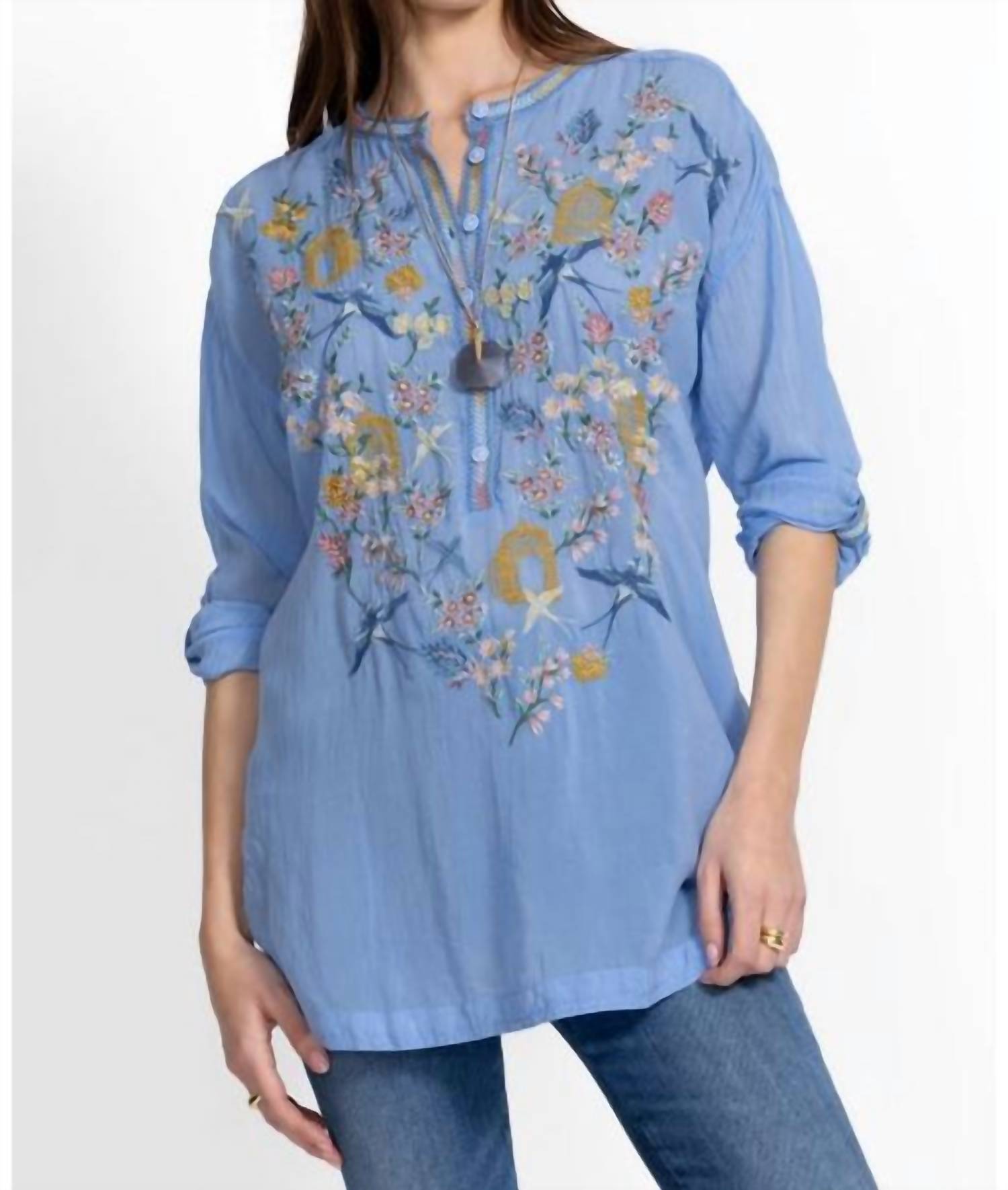 Discover the versatile charm of this tunic blouse, designed with both layering and standalone wear in mind. Its flattering silhouette and stylish details make it a closet essential. The Zitka Zinnia Tunic offers a fresh update to the traditional Henley, featuring vivid floral embroidery for a splash of color. With its tunic-length silhouette, Henley neckline, roll-tab sleeves, and softly curved hem, it blends classic style with modern flair.