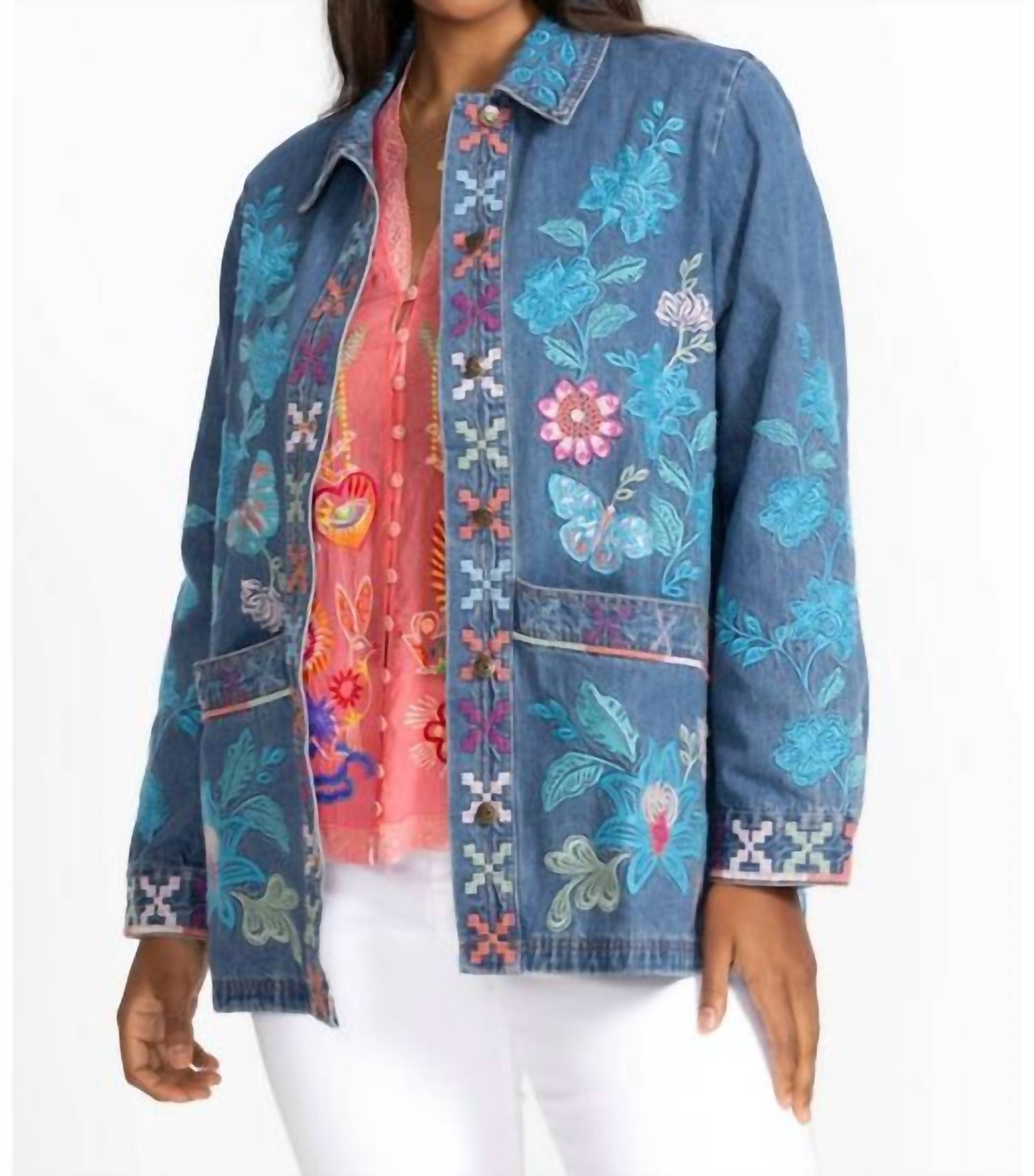 Throw this adorable jacket over just about anything for an effortlessly stylish look. Introducing the Johnny Was Petra Long Denim Worker Jacket in Denim Blue, a standout piece perfect for the season. This plus-size jacket, crafted from 100% cotton denim, features intricate floral embroidery and long sleeves. It boasts a button closure with a contrasting border at the front and is equipped with convenient slip pockets. For care, simply machine wash this stylish jacket.