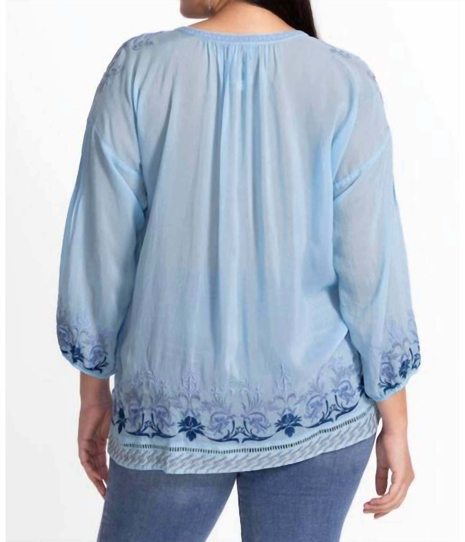 Pair this with your favorite jeans and slides for your next girls night out. Discover the Margot Blouse Melanie by Johnny Was, a stunning addition to your summer wardrobe in an elegant Etheral Blue. This plus-size blouse is made from 100% Cupro and features three-quarter sleeves with an intricate floral pattern. It boasts a split V-neckline with delicate ties and offers a relaxed fit with elastic cuffs and side slits. Closure: Pull on. Care: Hand wash.