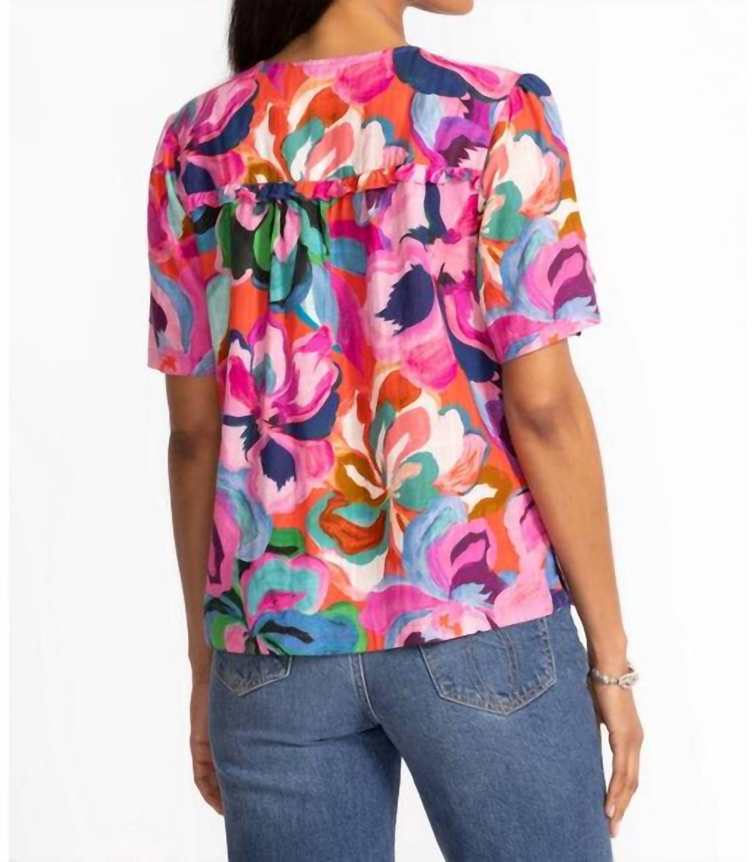 Pair this with your favorite jeans and slides for your next girls night out. Embrace vibrant style with the Ruffle Seam Top by Johnny Was in stunning Ambre. This plus-size blouse is made of 100% breathable cotton, showcasing a floral pattern perfect for summer. It features a flattering short sleeve and a chic split V-neckline with an embroidered placket, enhanced by ruffle details at the neckline and shoulder seams. Care: Machine wash. Closure: Pull on.