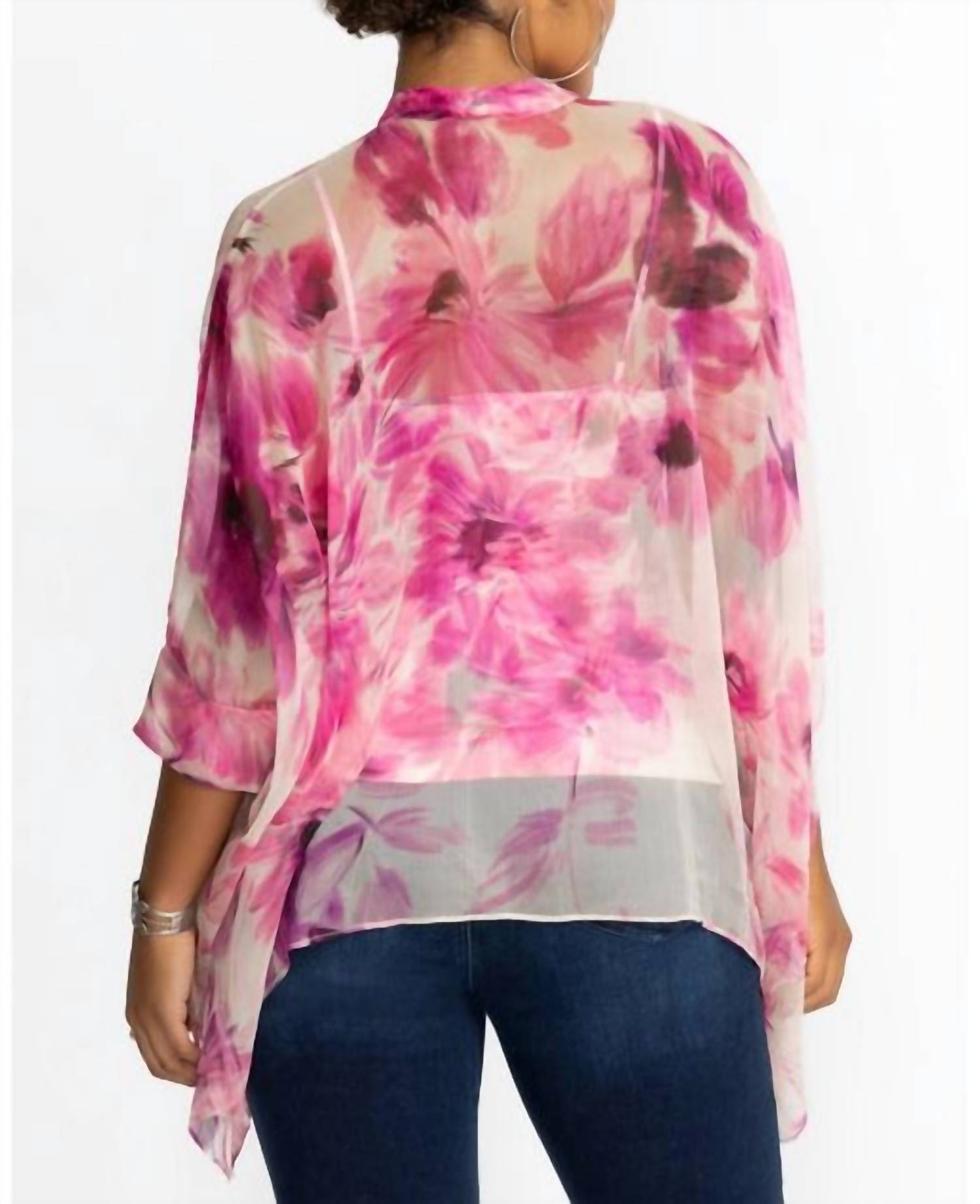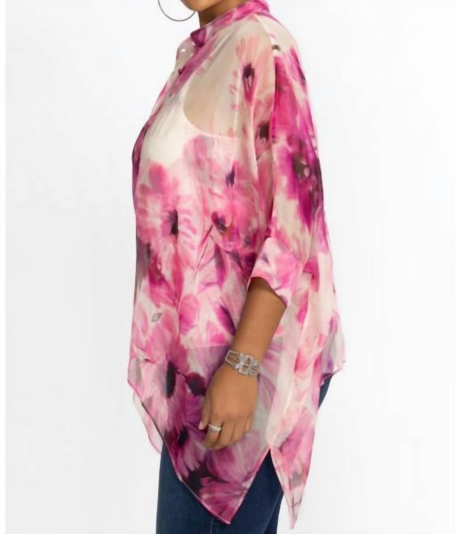 A versatile blouse that works from desk to dinner! Made from 100% silk, this oversized blouse offers a bold take on the classic button-down shirt. With its lightweight, flowing fabric and vibrant floral design, it features a banded collar, relaxed silhouette, and a chic handkerchief hemline for an effortlessly stylish look.