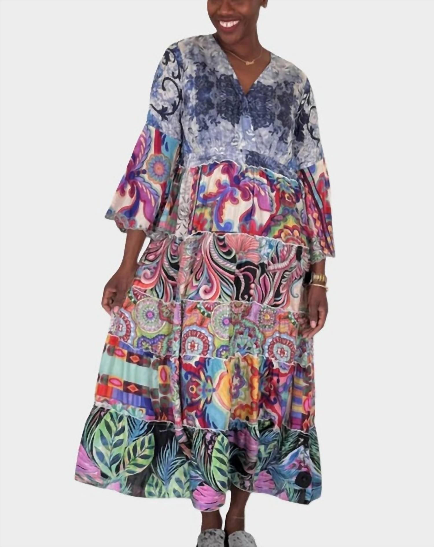 Style this maxi with your favorite statement necklace and sandals for the perfect look. Unleash your style with this stunning dress, which is ideal for the free spirit within you. Adorned with intricate patterns and details, you'll undoubtedly attract attention in this unique piece! This dress is made from 100% silk and features a V-neckline, bell sleeves, and stylish waist ties.