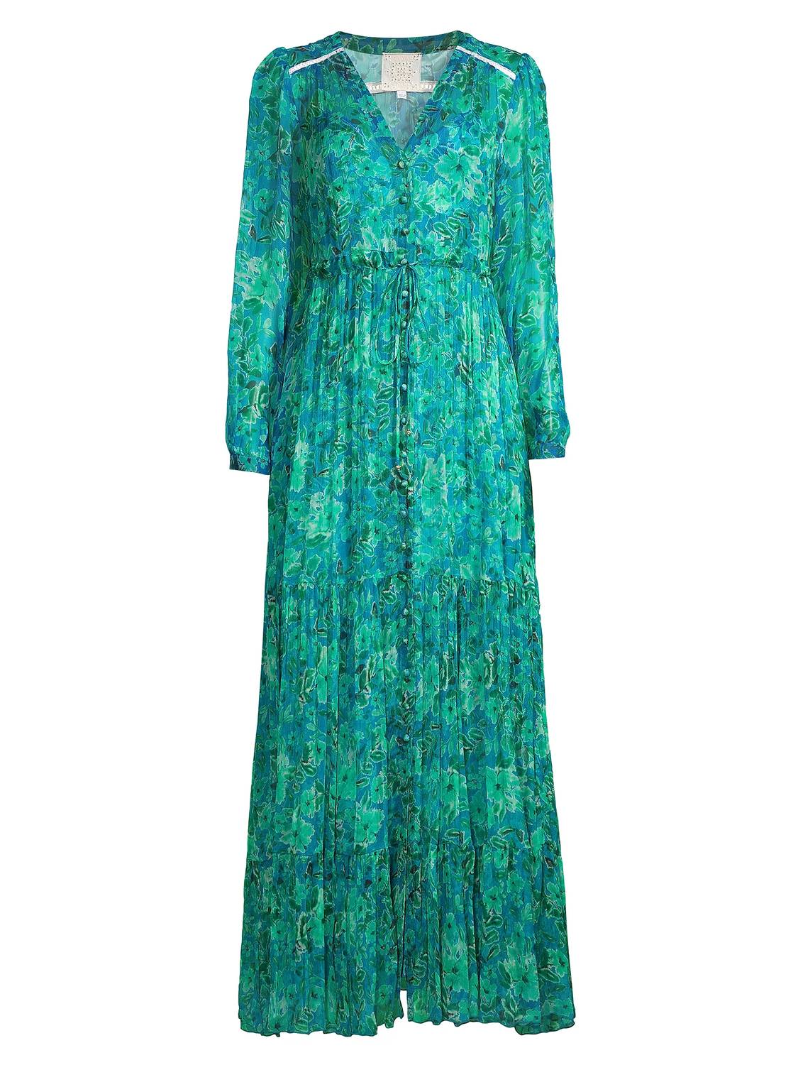 A maxi dress that is just as cute as it is comfortable. Discover the Raquel Silk Maxi Dress by Johnny Was, a boho-chic essential in a vibrant multicolor floral pattern. This luxurious piece features long sleeves with button cuffs, a flattering V-neck, and a drawstring waist for an adjustable fit. Measuring approximately 55 inches from shoulder to hem, the tiered skirt adds elegant movement with a button-front closure for easy wearing. Crafted from 100% silk and imported, it requires dry cleaning to maintain its exquisite quality. Model is 5'10" and wears a US size Small, perfect for holiday parties and Thanksgiving gatherings.