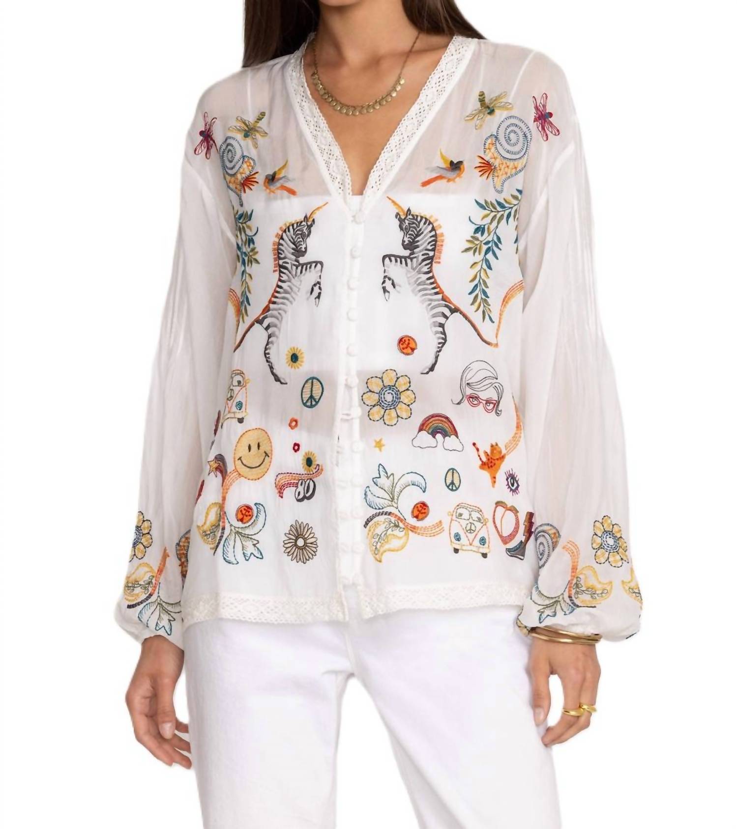 Crafted from a lightweight breezy material. Featuring a V-neckline and gently puffed sleeves, this blouse is intricately detailed with colorful placement embroidery. 100% Rayon. Measurements for size Medium: Bust - 45 1/2" Length - 26". Care Instructions: Machine wash cold. Only non-chlorine bleach when needed. Tumble dry low. Warm iron.