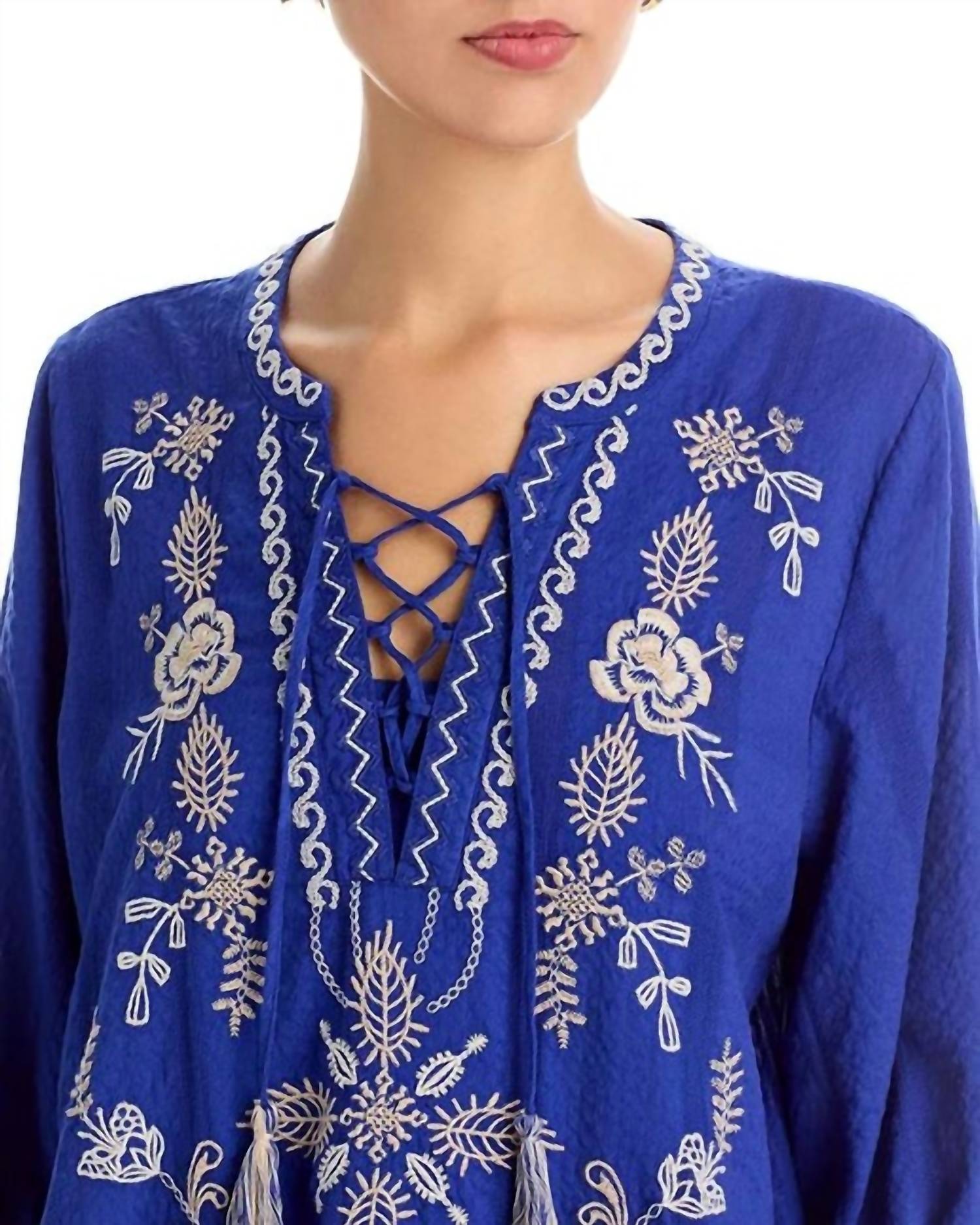 Casual, comfortable and cute! The dress that you'll be reaching for all season long. Johnny Was. This comfortable kimono sleeve dress is both cute and fun to wear. It features a round neckline with a front lace-up design and is a pullover style. The elbow-length sleeves have ties and tassels at the cuffs. Additionally, decorative embroidered detailing throughout the dress makes it stand out in a crowd. The model is 5'10" and wearing a size small. Machine Wash
