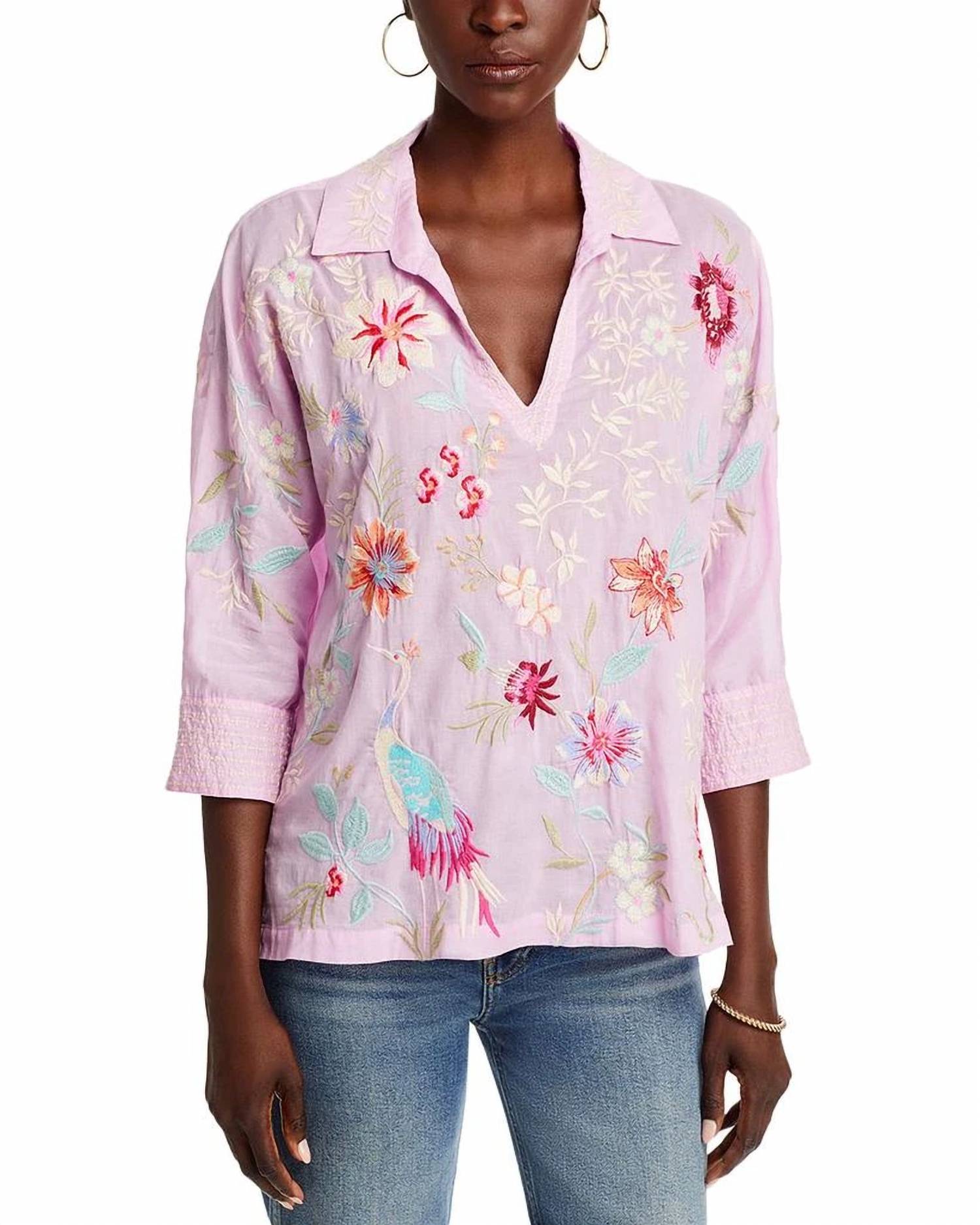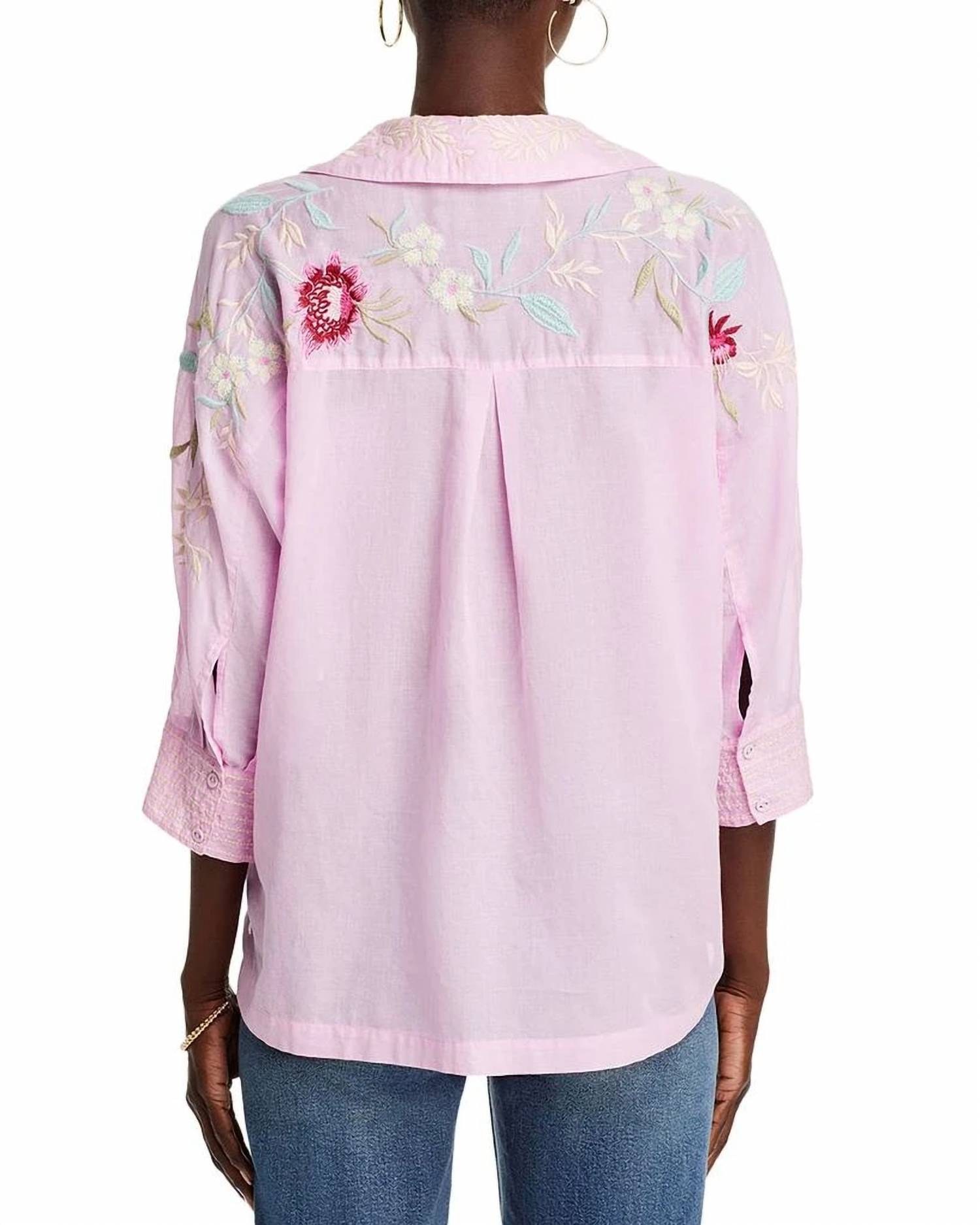 A versatile blouse that works from desk to dinner! This is a floral blouse in a soothing shade. Designed with elbow sleeves and a collar neckline, this piece effortlessly combines elegance and comfort. Easy to care for, simply machine wash and lay flat to dry. Enjoy a chic look without pockets to keep the focus on its exquisite pattern. Crafted from 100% cotton.