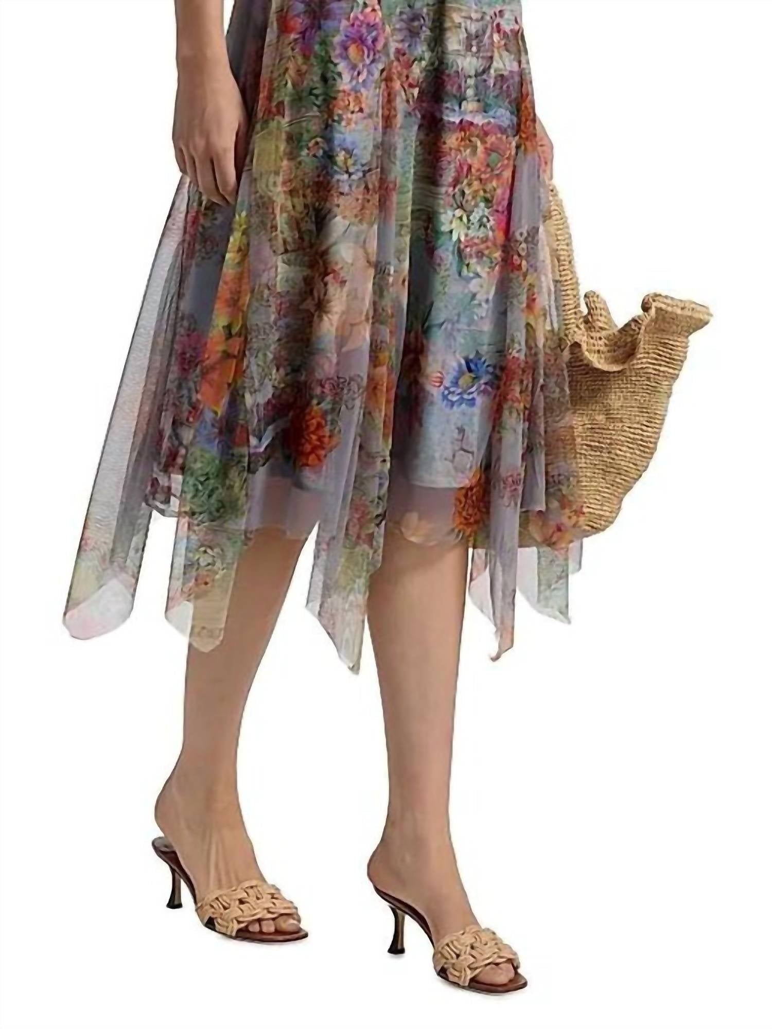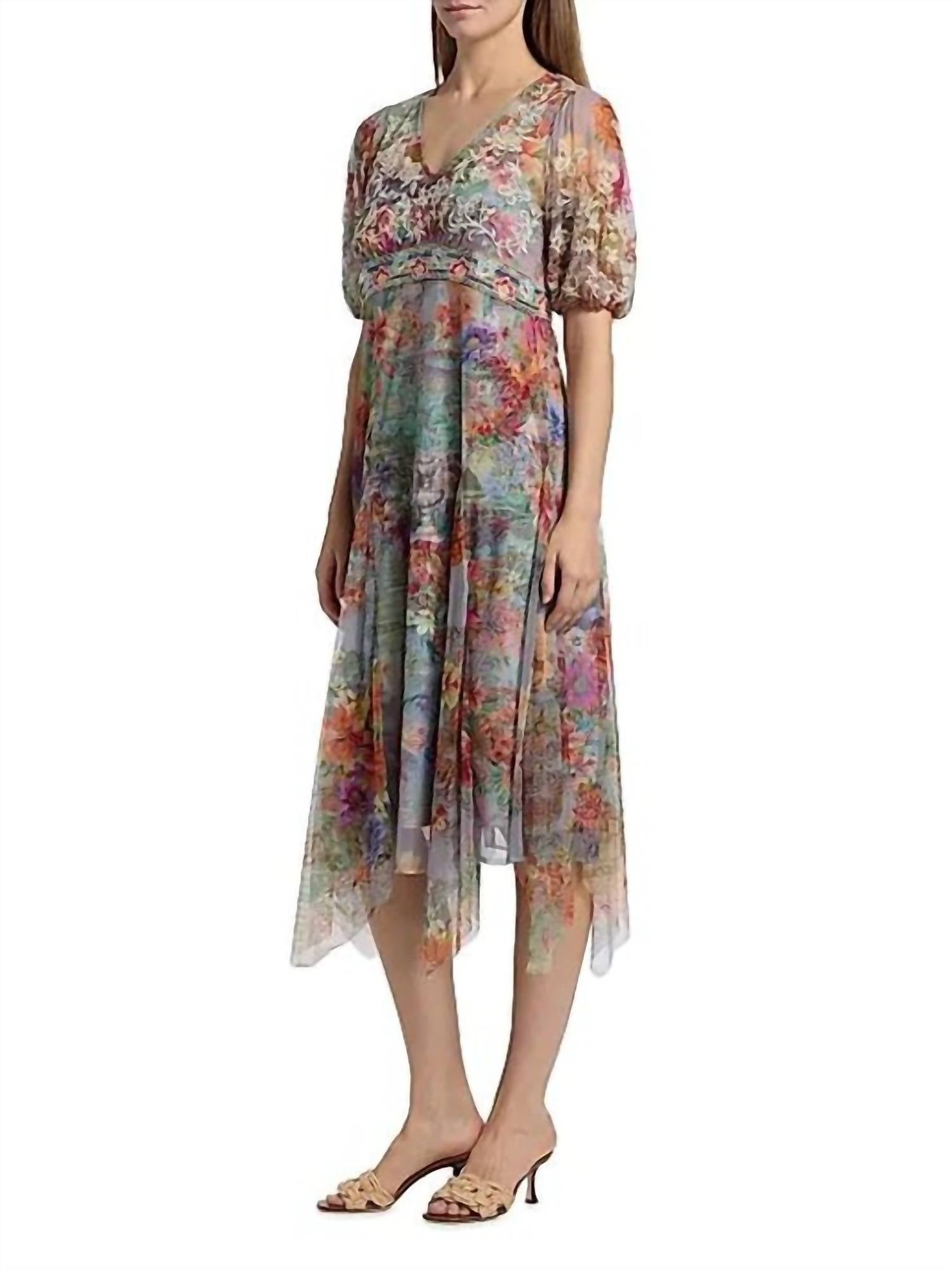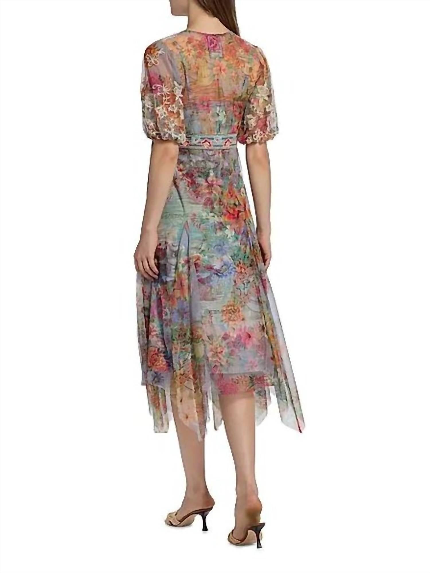 Just add slides or mules and you are good to go. This Sally dress is made from nylon with a mesh overlay that flows into a handkerchief hem for playful movement. It features intricate embroidery on the bust and short puff sleeves. Additionally, it features a V-neckline and can be easily pulled over for convenience. Approximately 48" from shoulder to hem. The model is 5'10" and wearing a size small. Hand Wash
