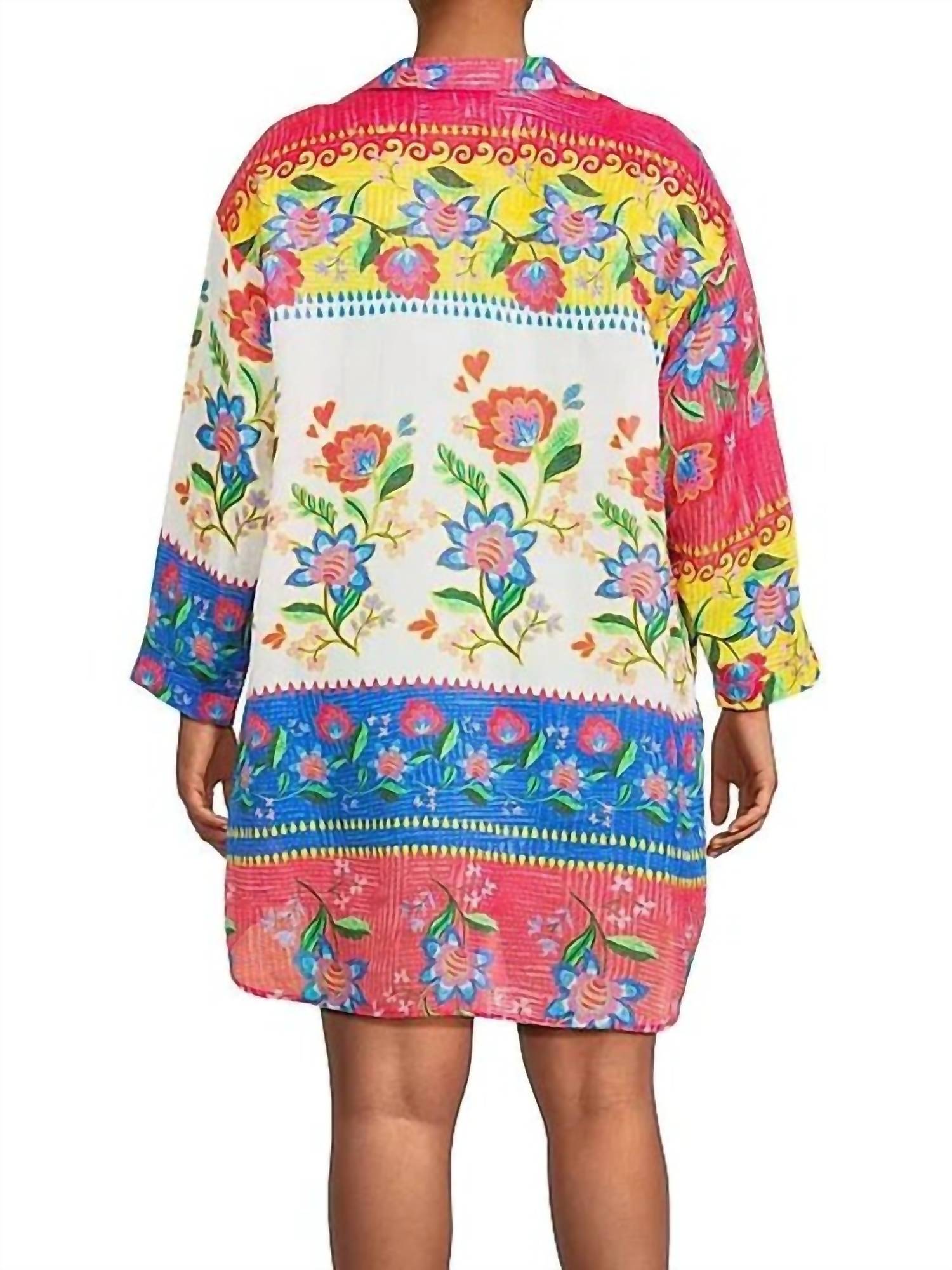 Casual, comfortable and cute! The dress that you'll be reaching for all season long. Crafted from 100% ramie, this button-down dress shirt showcases a striking patchwork of patterns, bringing a vibrant and artistic flair to any look. It features a classic collared button front, roll-tab sleeves for versatile styling, and a gently curved hemline for a polished finish.