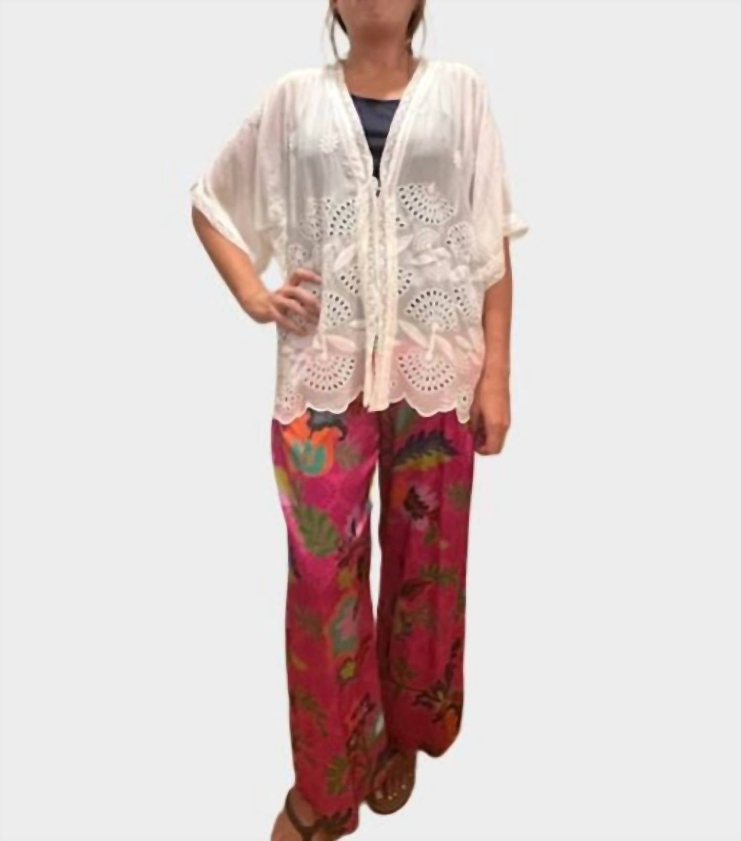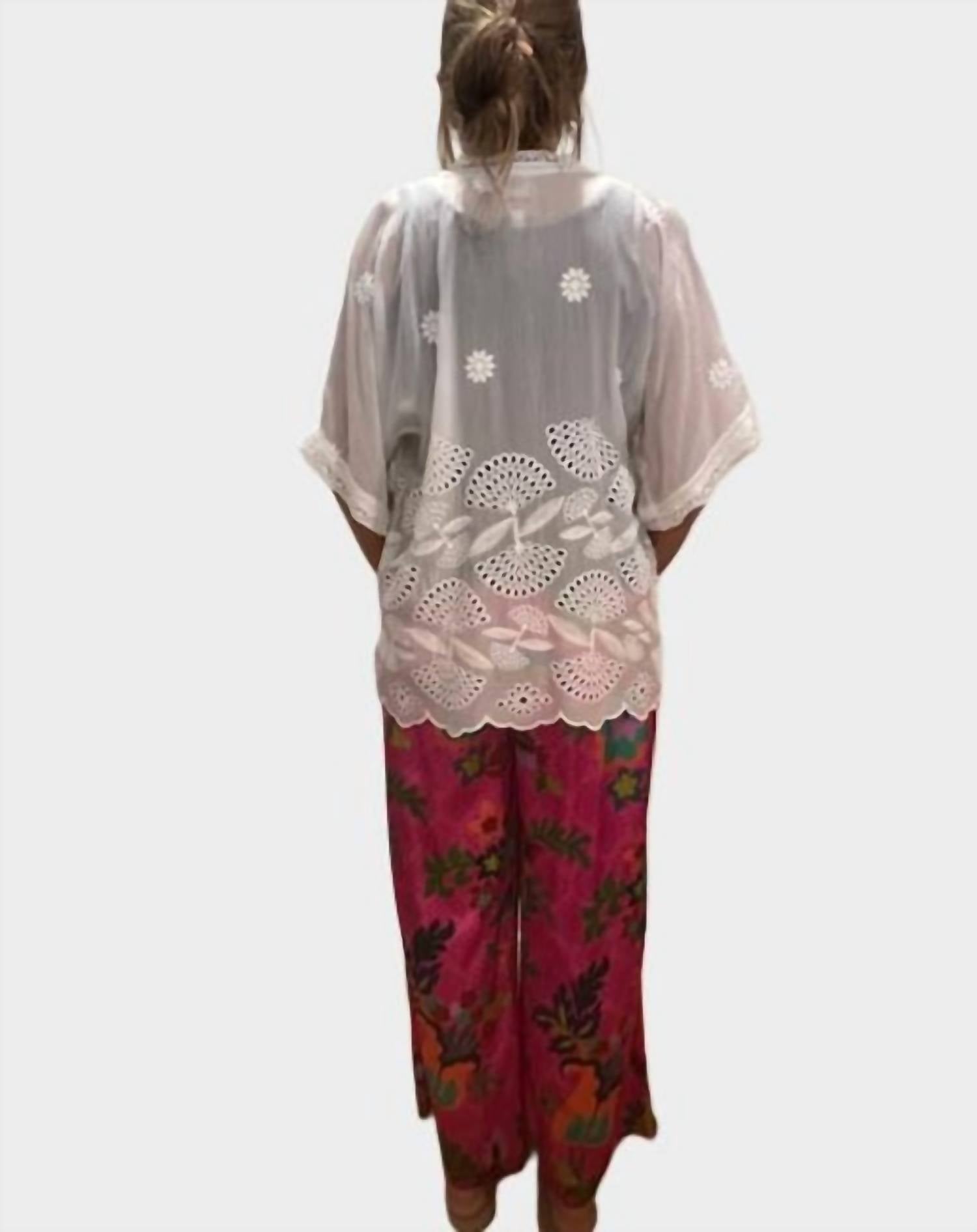 The trend report says boot-cut is in and that's exactly why we love this style. They are fit to perfection, flattering on any body type, and comfortable. They will be your go-to all season long. The perfect travel pants! Where comfort intersects with style and fun. The Lauchlen Pants are beautifully adorned with a vibrant floral pattern and crafted from a silk blend with a touch of spandex for added stretch. Comfort is key in these unique pants, which are sure to impress. Hand Wash. The model is 5'10" and wearing a size Medium.