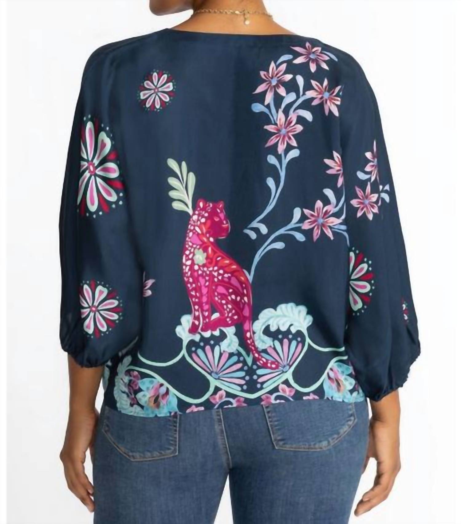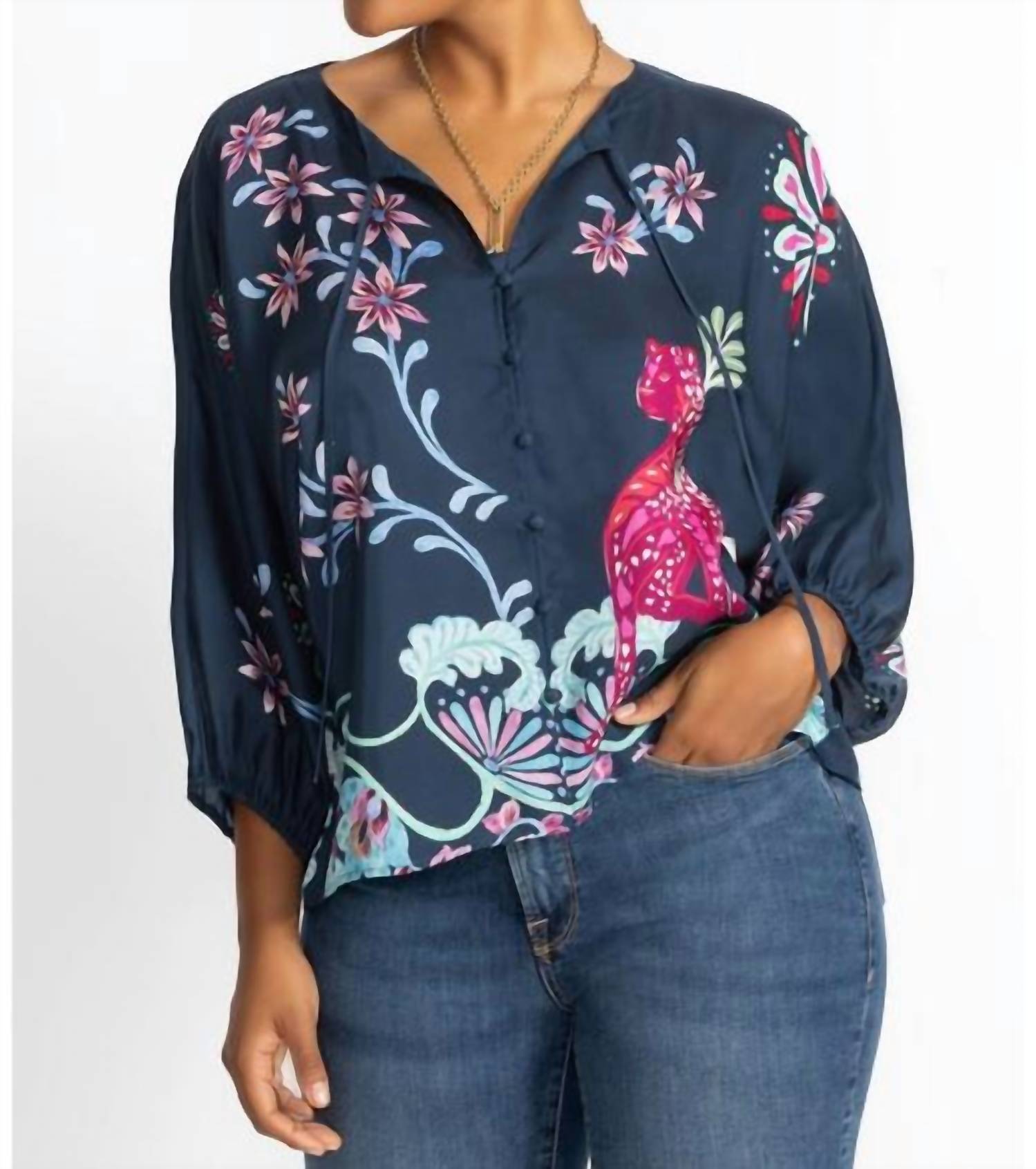 A versatile blouse that works from desk to dinner! This button-front blouse offers a fresh take on the classic shirt, crafted from a luxurious blend of 70% rayon twill and 30% silk for a soft, elegant drape. It features a tied keyhole neckline and flowing dolman sleeves, beautifully accented with vibrant floral and fauna patterns that add a touch of charm and sophistication.