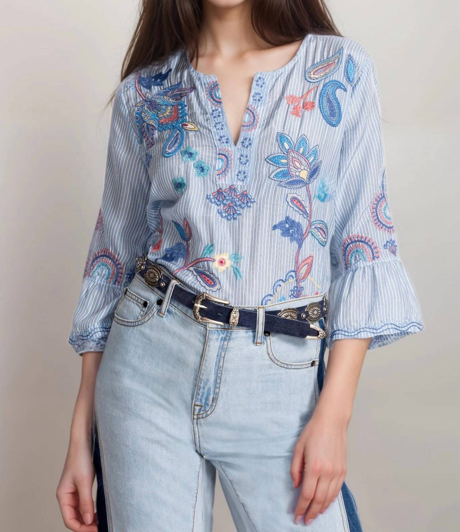 A timeless blouse that will never go out of style. Elevate your wardrobe with the Neilly Ruffle Sleeve Blouse by Johnny Was, a luxurious piece crafted from 100% silk for a lightweight feel and breathable comfort. The three-quarter sleeves with ruffle cuffs and a split v-neckline imbue feminine charm, enhancing its boho-inspired paisley embroidery over a chic striped design. Closure: Pull on style for easy wear. Care: Hand wash and lay flat to dry, ensuring its delicate fabric maintains its beauty. Perfect for transitioning from day to night, this blouse is a versatile addition to your summer collection.
