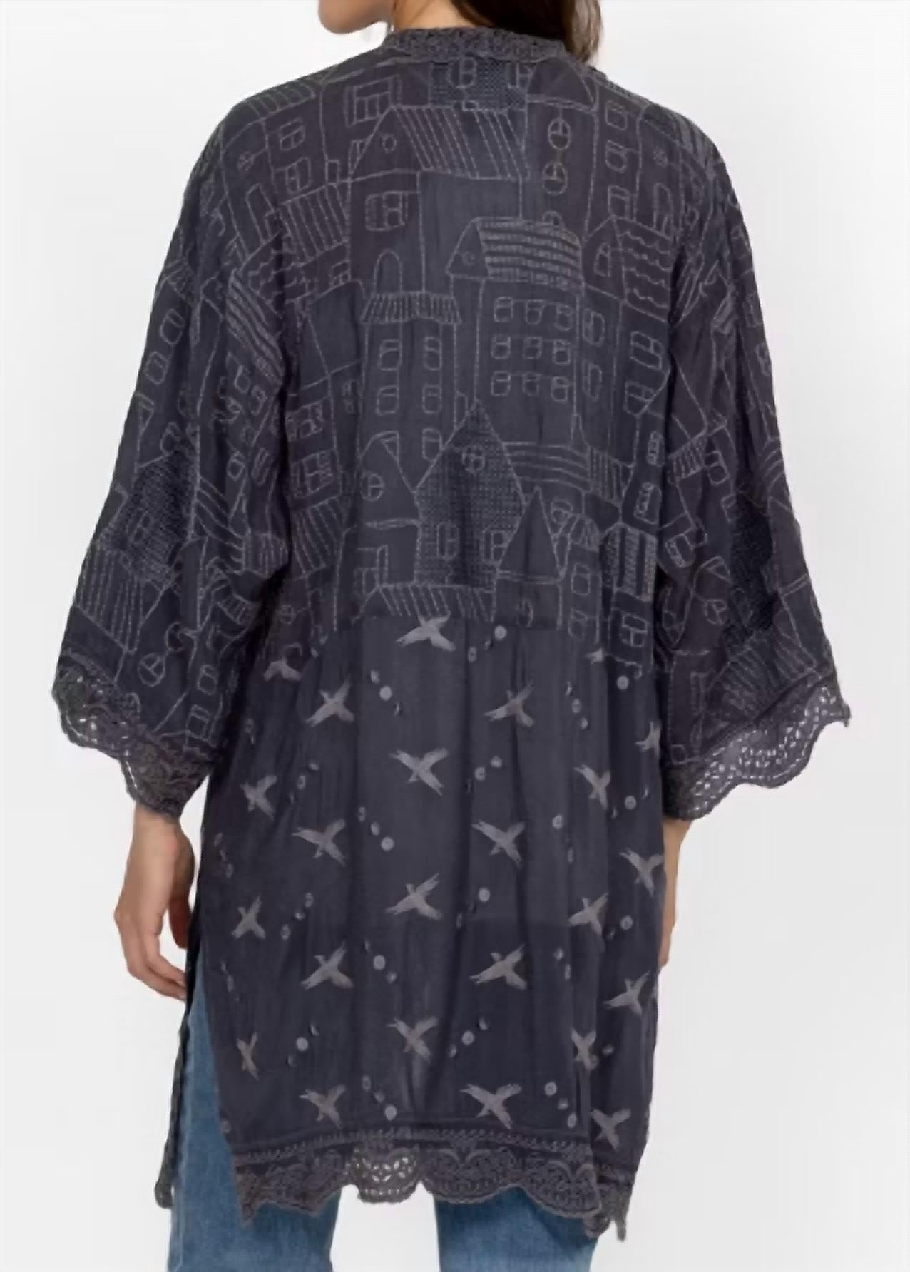 Cooler temps call for layering and we love this adorable sweatshirt for all the obvious reasons. Experience the dreamy House Ecaterina Kimono by Johnny Was, a boho chic piece in luscious graphite. This women's kimono, perfect for a beach day or Thanksgiving, boasts long sleeves and a textured pattern, offering style and comfort. Made from rayon with a tie closure, its 37-inch length will add elegant flow to your look. For easy maintenance, machine wash and tumble dry.