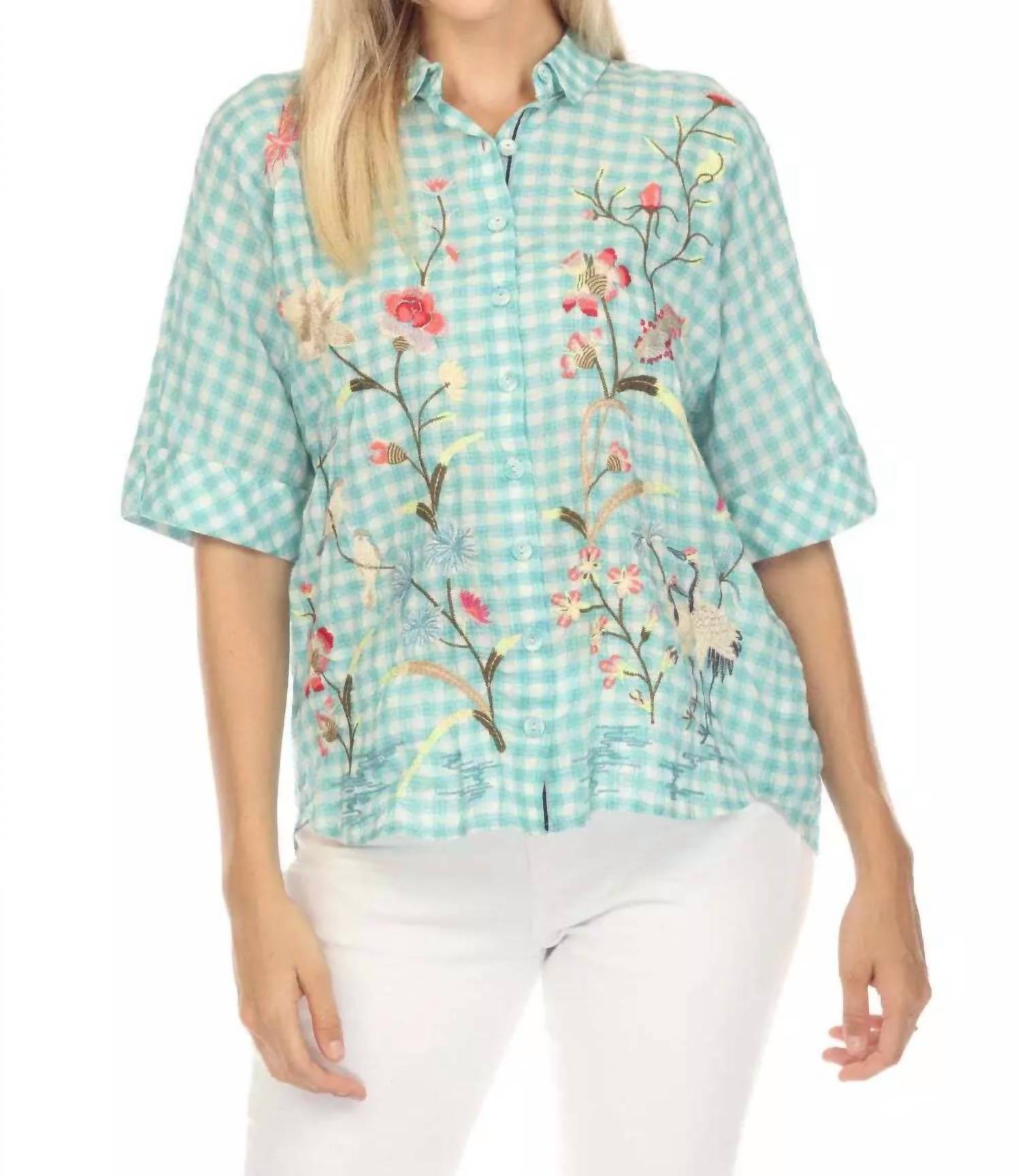 Perfectly tailored and soft to the touch. Presenting the Geniveve Relaxed Dolman Shirt by Johnny Was, a refreshing take on traditional styling with soft plaid and check patterns. This women's shirt features elbow-length dolman sleeves, crafted from a blend of 99% cotton and 1% polyester for a comfortable and relaxed fit. Originating from the brand's attention to detail, it is adorned with placement embroidery and thread-covered buttons. Closure: Button closure. For easy wear and care, machine wash cold and tumble dry on low, followed by a warm iron.