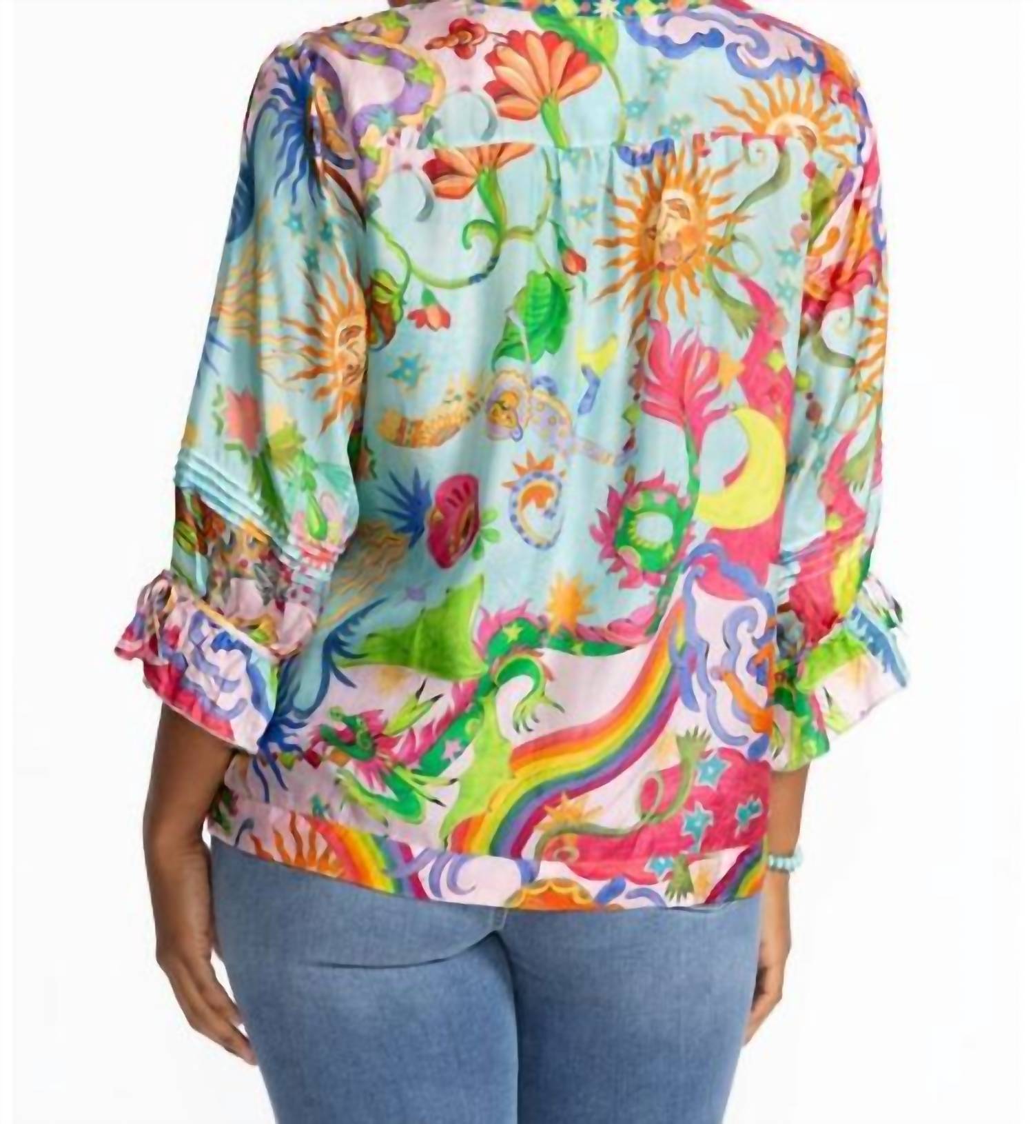 Pair this with your favorite jeans and slides for your next girls night out. Introducing the Vacanza Blouse by Johnny Was, an eye-catching piece in the vibrant Kayla shade. This blouse showcases three-quarter sleeves with ruffled hems, a V-neckline, and intricate pintuck details. Made from 100% sumptuous silk with a graphic pattern, it offers elegance and comfort. Closure is with button and care is simple with hand washing recommended.