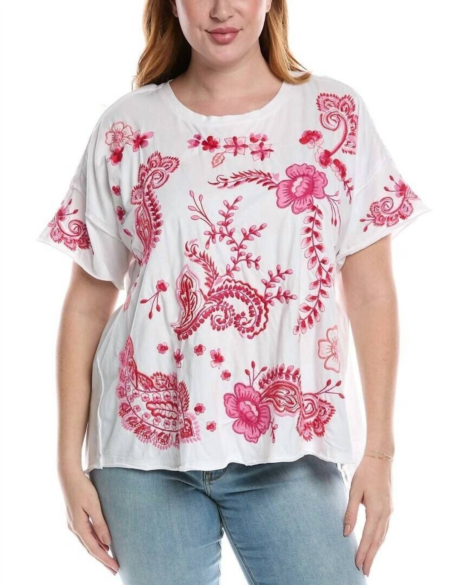 Look no further, you just found your perfect tee! The Cassia Raw Detail Swing Tee by Johnny Was is a stylish addition in crisp white, featuring intricate contrasting floral embroidery and raw seam detailing. This women's plus-size tee offers short sleeves and a chic hi-low hem, crafted from 100% cotton for comfort. Designed with a crew neckline and a pull-on style closure. Care is easy with machine wash cold instructions, and you can tumble dry.