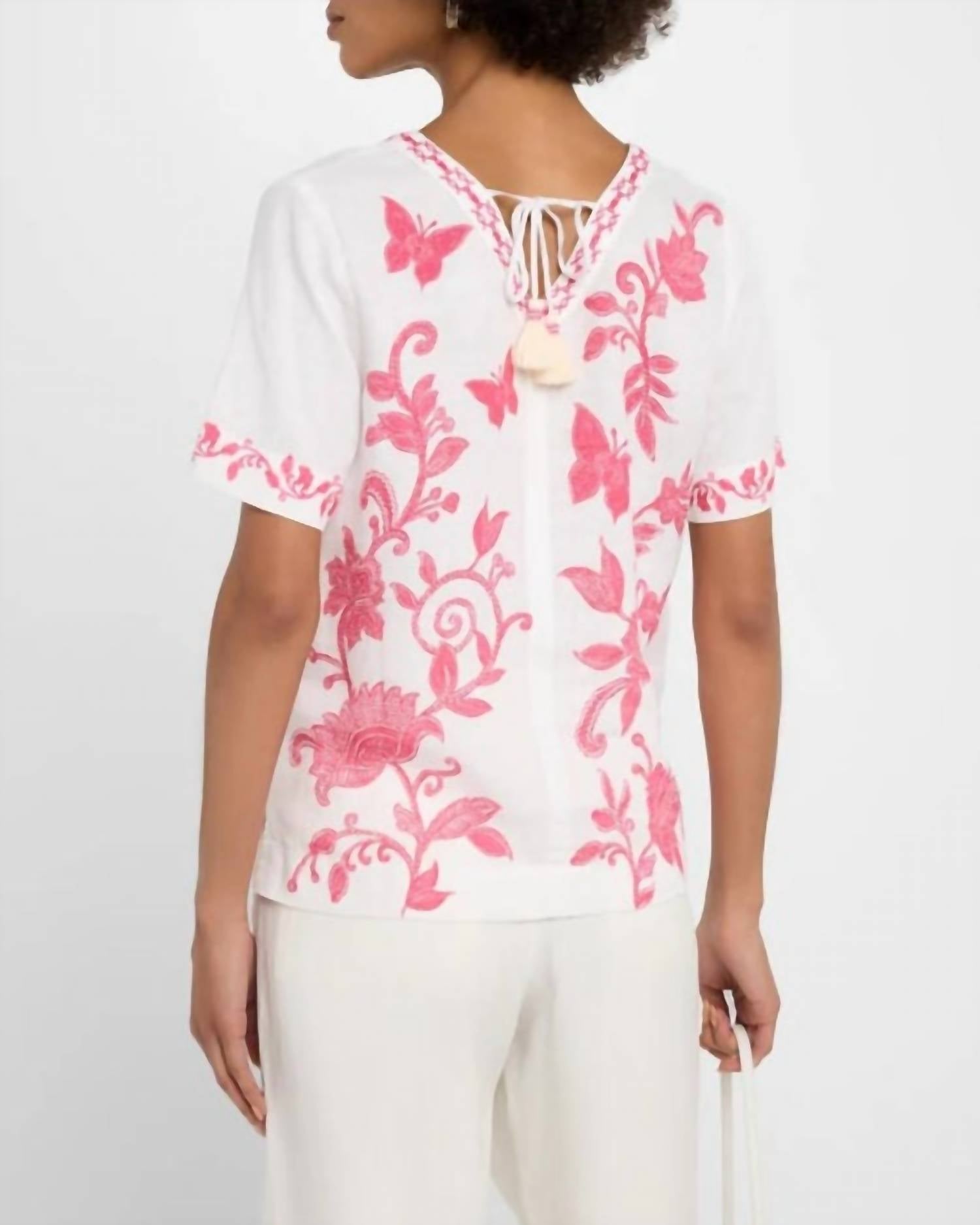 Fit, fabric and functionality. This tank top checks all the boxes. Embrace elegance with this Johnny Was linen blouse featuring a floral and butterfly print, complete with embroidered details. It has a tasseled self-tie at the upper back, a V neckline, short sleeves, and a relaxed fit. The blouse is designed as a pullover for easy wear. Hand Wash