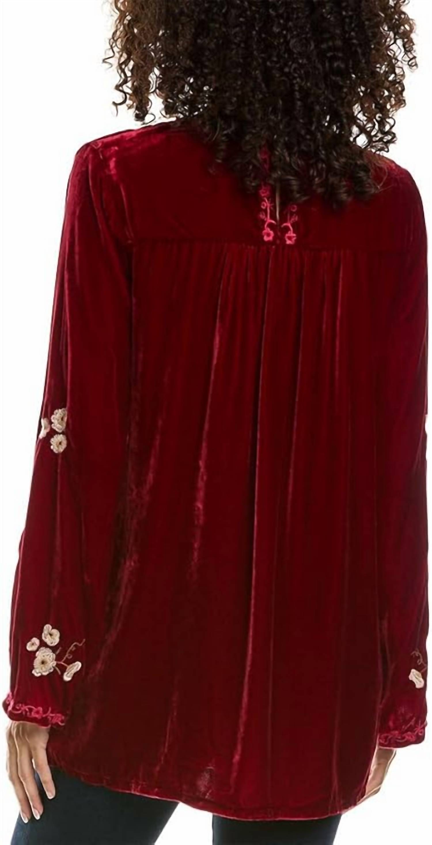 A perfect addition to any wardrobe, this classic tunic style blouse is flattering and effortless. You can easily transition from desk to dinner in this chic top. Elevate your beach day style with the Quinn Velvet Kimono Sleeve Tunic by Johnny Was, perfect for a summer picnic or Valentine's Day outing. Crafted in a luxurious rich red floral pattern, this boho chic tunic is made from soft rayon with long sleeves and a classic crewneck design. The button closure adds a touch of elegance to this vibrant women's piece, ensuring a flattering fit without pockets. To maintain its exquisite quality, professional dry cleaning is recommended.
