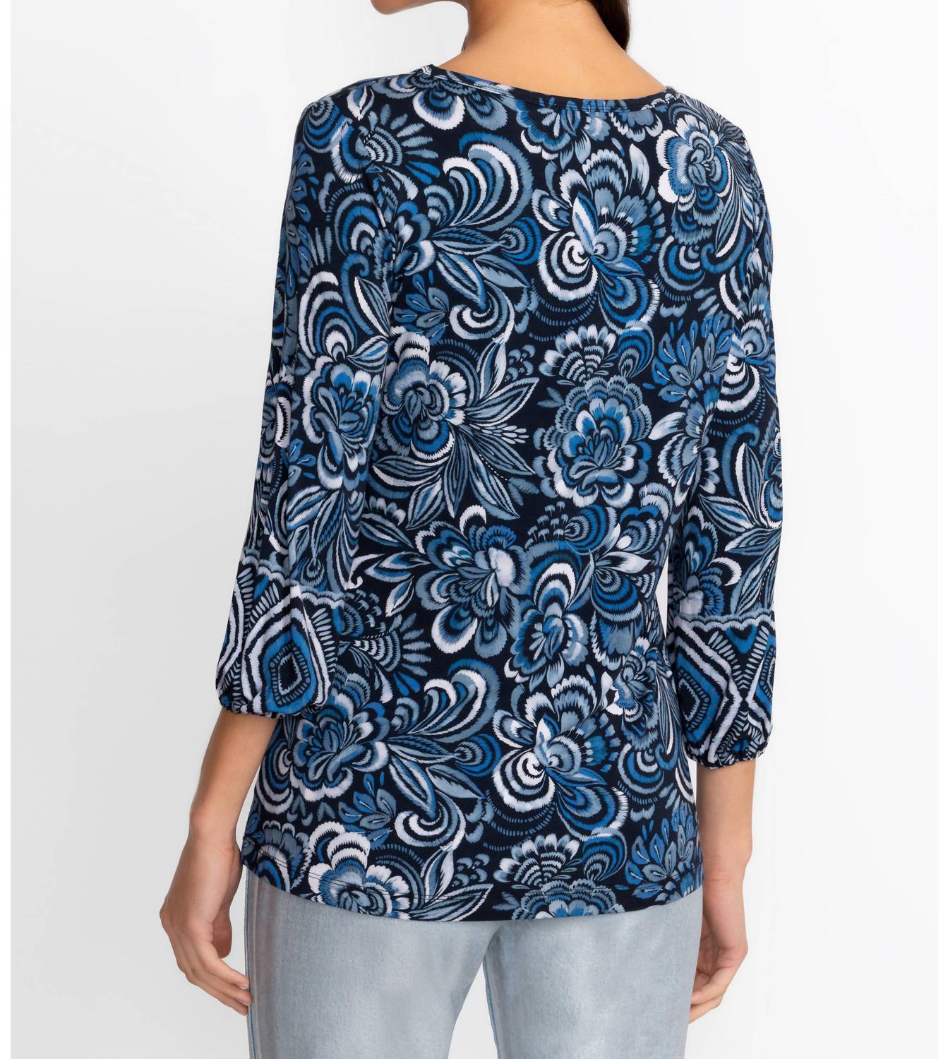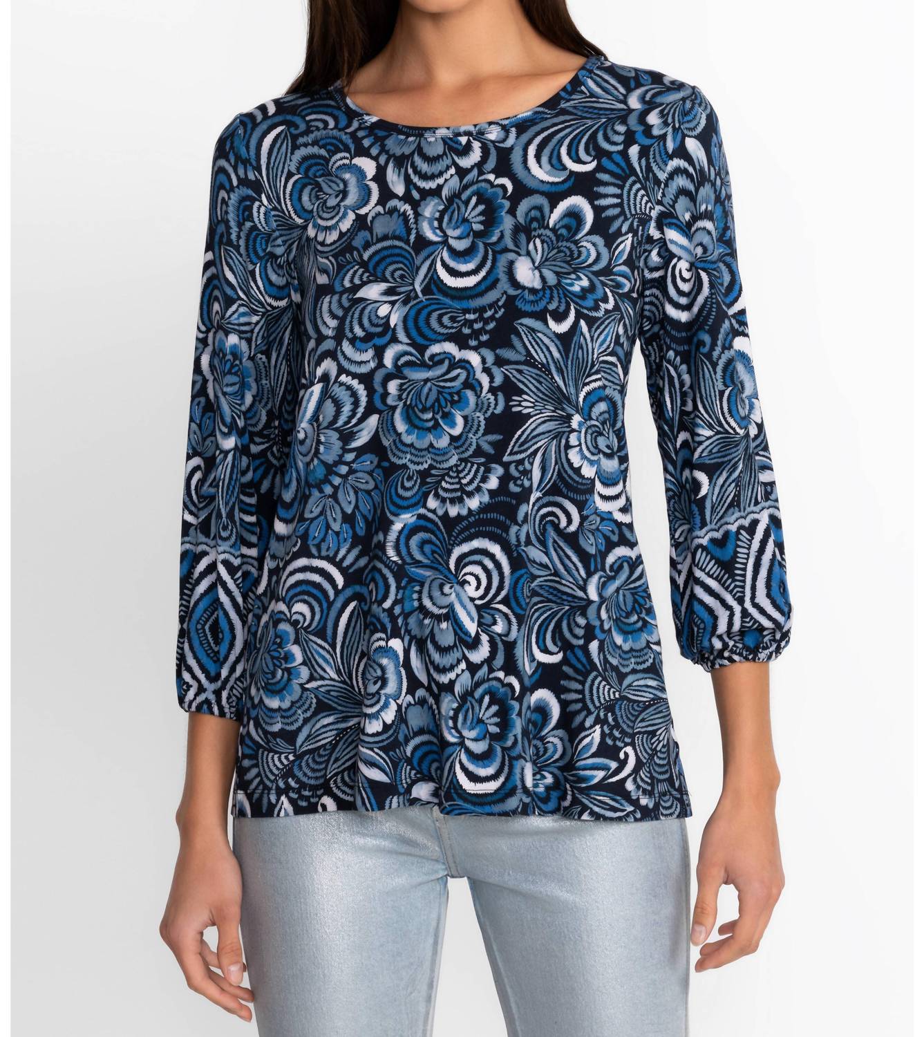 A versatile blouse that works from desk to dinner! Experience the charm of the Janie Favorite Puff Sleeve Knit Tee by Johnny Was, featuring three-quarter puff bell sleeves with an elastic cuff. Made from a lightweight blend of 95% Rayon and 5% Spandex, this luxurious tee offers a hint of stretch for added comfort. The floral pattern in hues of blue adds a touch of elegance, while the pull-on style ensures ease of wear. Care instructions include machine wash cold, non-chlorine bleach when needed, tumble dry low, and warm iron. Measurements for size Medium are Bust: 38 1/2" and Front Length: 26 1/2". Model is 5'10" wearing size Small.