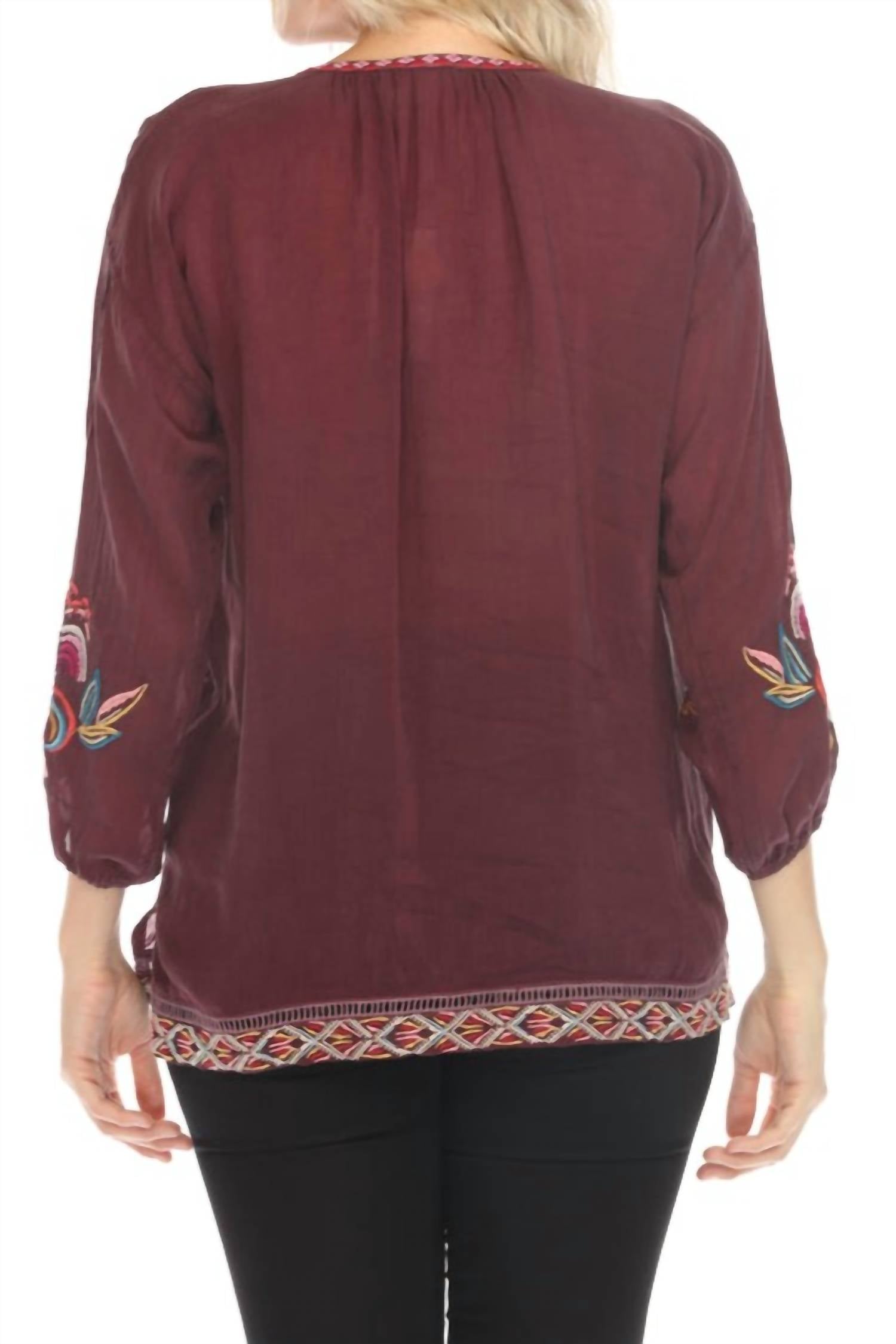 Pair this with your favorite jeans and slides for your next girls night out. This blouse showcases three-quarter sleeves with elastic cuffs and a charming V-neckline featuring a tassel tie. Material: 100% Cupra Rayon. Closure: Pull-on style. Machine wash, tumble dry.