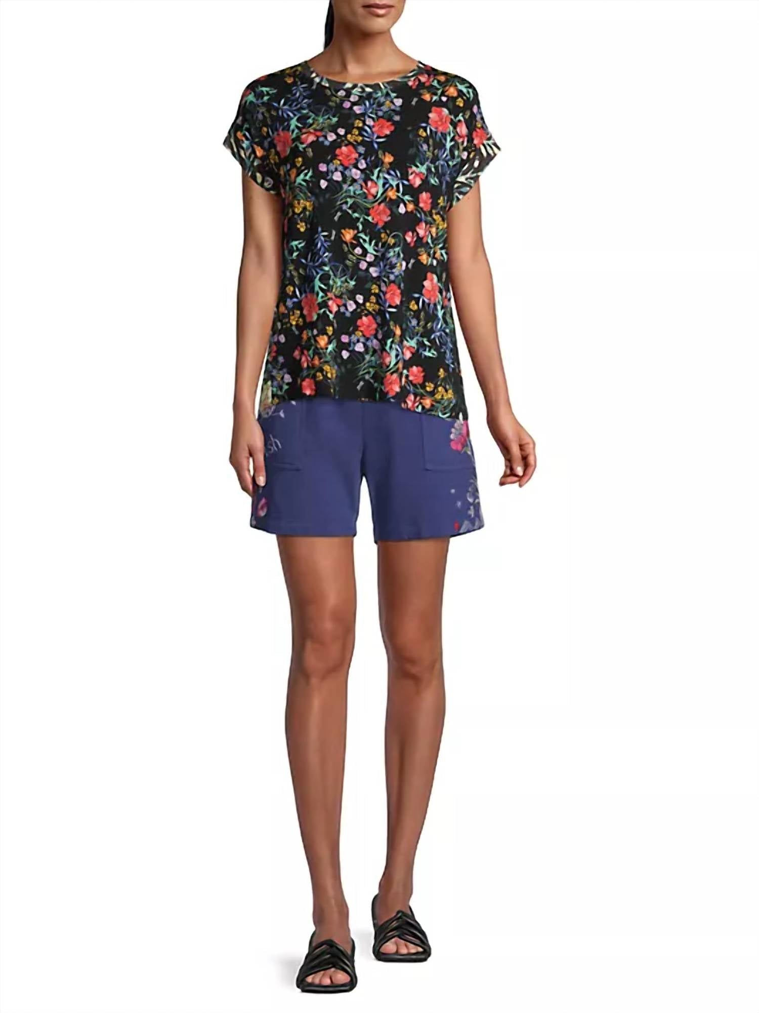 Johnny Was' Kashim relaxed t-shirt is adorned with a bright floral print in a lightweight fabric. Crewneck. Short sleeves. Pullover style. 95% bamboo/5% spandex. Machine wash. Imported. About 25.5" from shoulder to hem. Model measurements: 5'10" tall. Model is wearing a US size Small.