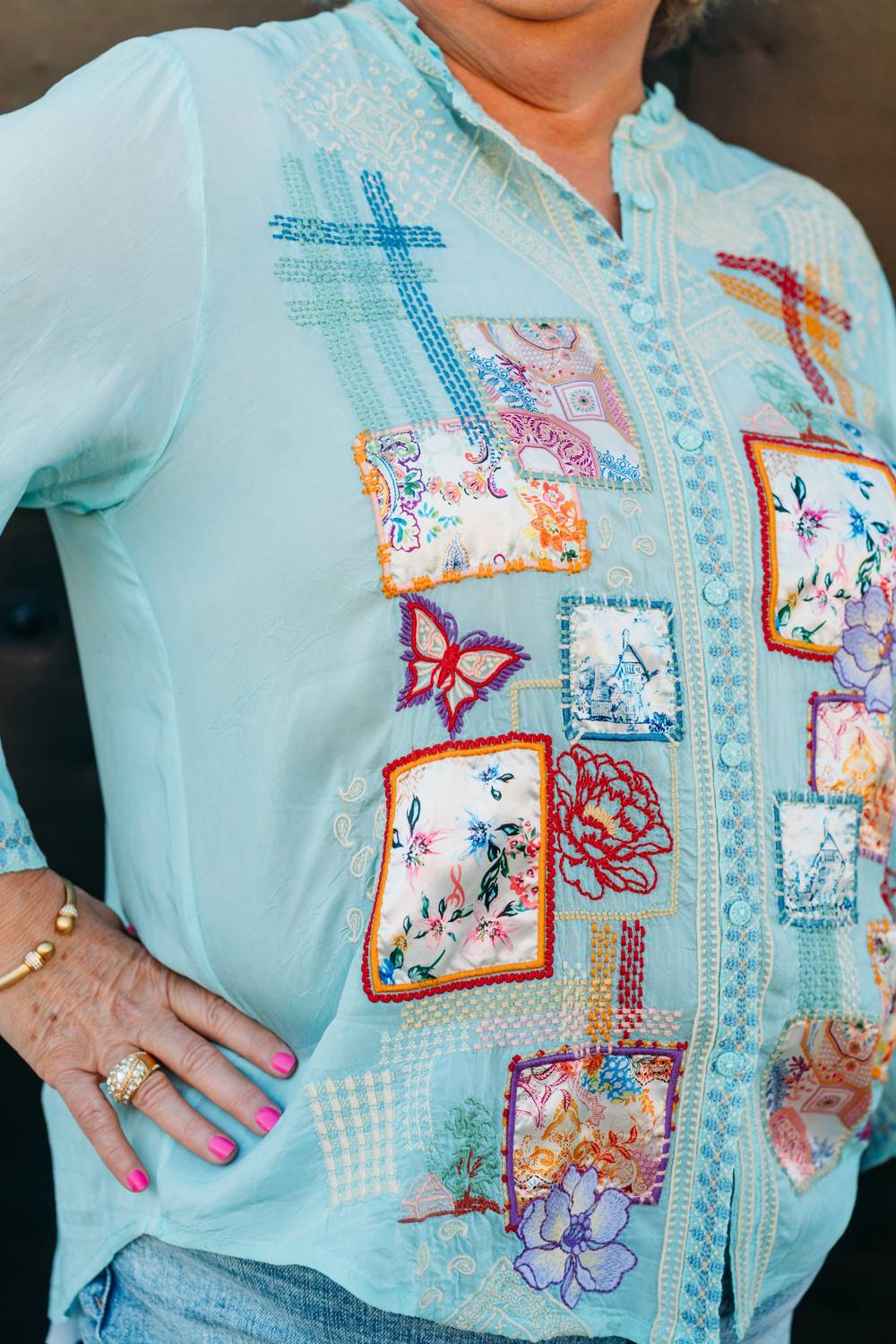 A classic button down shirt that will never go out of style. Introducing the Johnny Was Somalia Shirt, a vibrant addition to your wardrobe in striking Marine Blue Mab. Designed with three-quarter sleeves and a graphic pattern, this blouse offers both style and ease with its crewneck and button closure. This standout piece is perfect for springtime church occasions, showcasing a playful and unique design. Care instructions not provided.