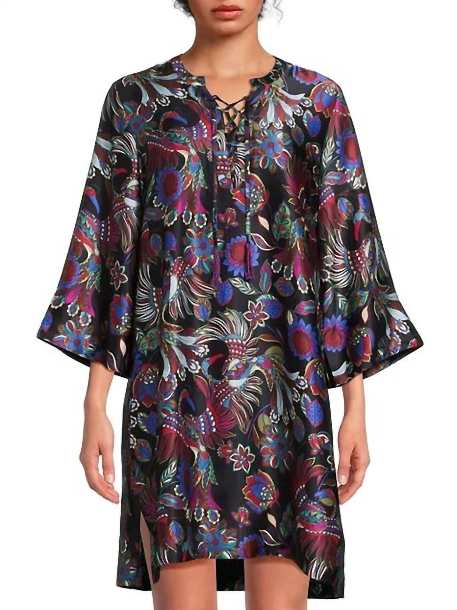The perfect mini dress for those warmer months. The Kimono-style Avya dress is bold and crafted from luxurious silk. It is embellished with a beautiful floral print and includes a beaded tie closure at the split neck. This dress has 3/4 length sleeves, side slits, and offers convenient pull-on styling. The overall dress length is approximately 36 inches from shoulder to hem.