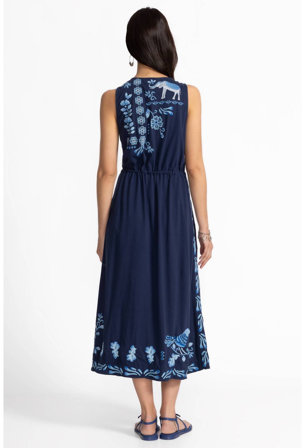 The perfect length dress does exist. Discover the Johnny Was V-Neck Drawstring Knit Dress in a stunning blue tone-on-tone pattern, perfect for your spring outings. This sleeveless, midi A-line dress is crafted from 100% breathable cotton and features a V-neckline with a customizable drawstring waist. With a pull-on closure and practical pockets at the hips, it seamlessly combines style and functionality. Measurements for size Medium: Bust - 39", Front Length - 47 1/2". Care: Machine wash cold, tumble dry low, warm iron. Model is 5'9" and wearing a size small.