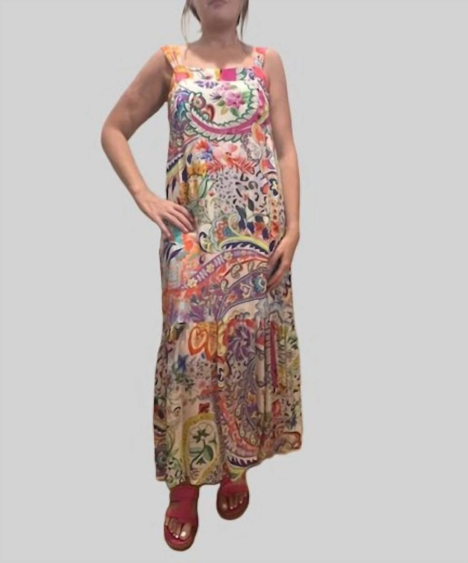 Style this maxi with your favorite statement necklace and sandals for the perfect look. Beautifully adorned with fun, bold colors, the Finley Dress is crafted from a lightweight, breezy fabric. Featuring wide shoulder straps and a relaxed-fit bodice, this elegant dress is finished with a drop-waist skirt embellished with an intricate trim detail. Throw on a jean jacket for the perfect fall outfit. Hand Wash The model is 5'10" and wearing a size Medium.