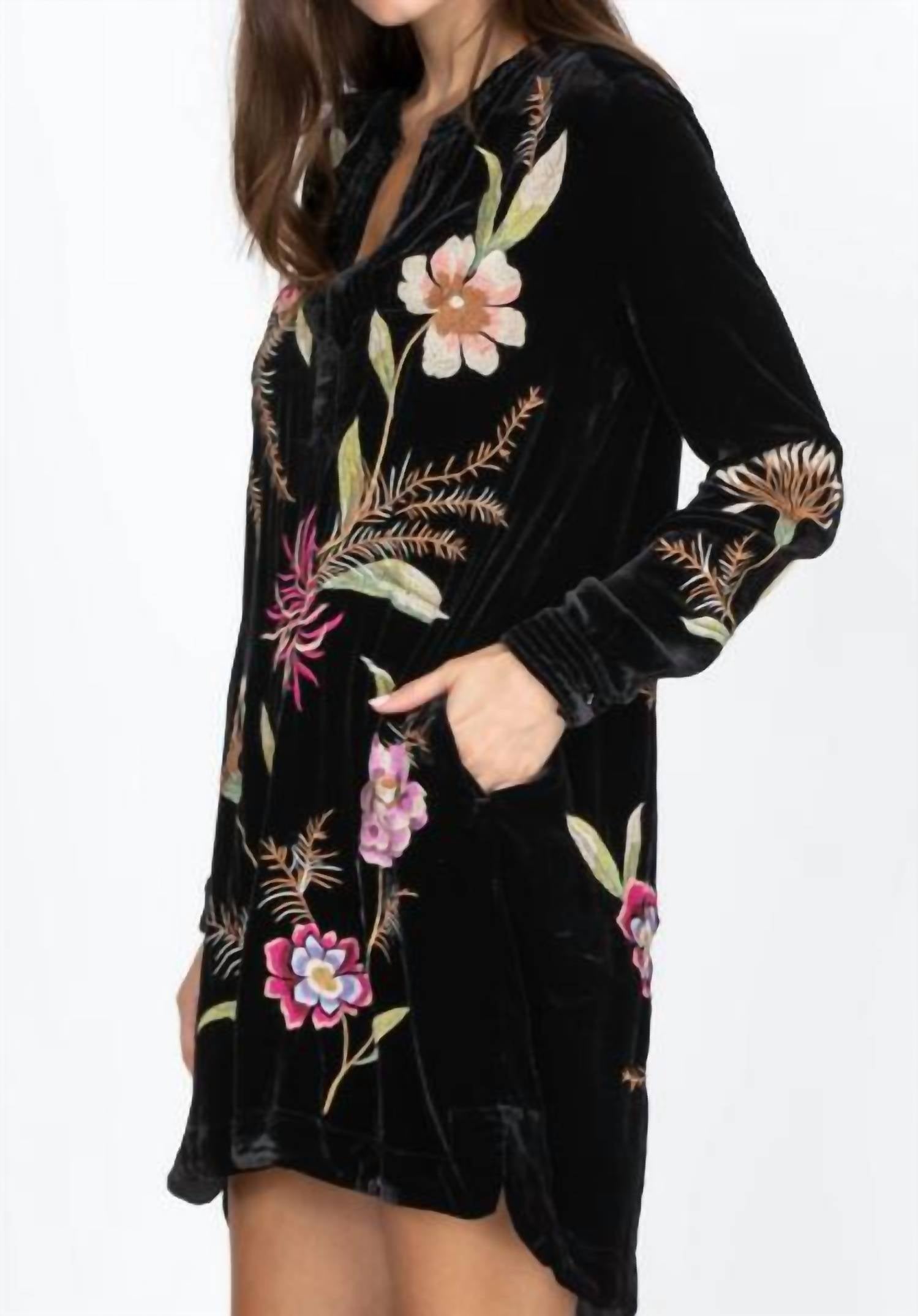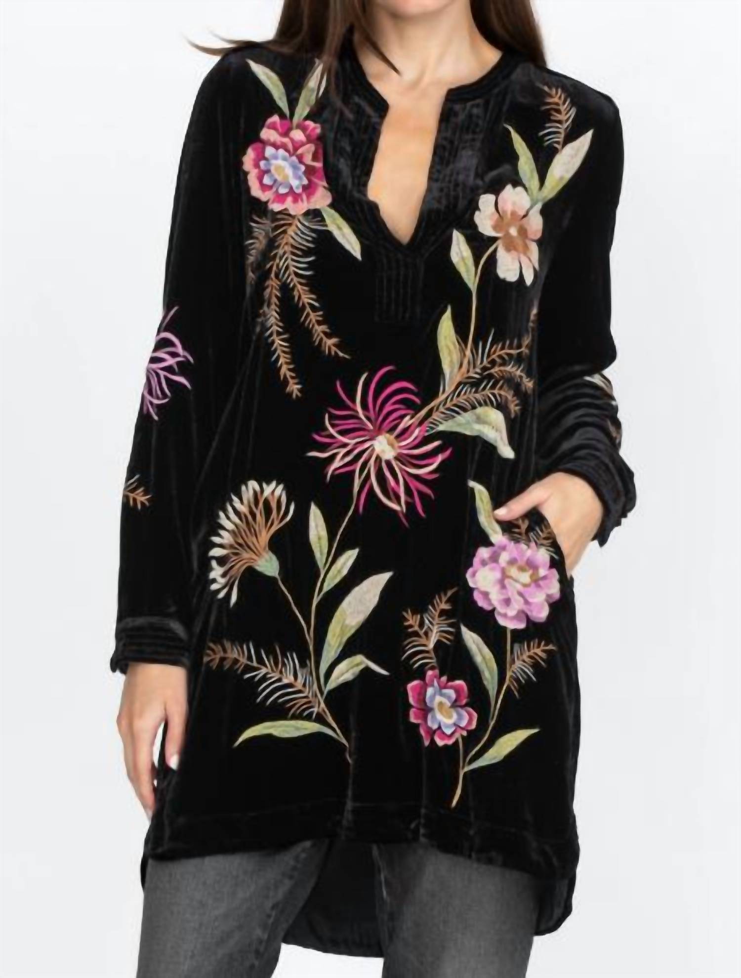 Discover the versatile charm of this tunic blouse, designed with both layering and standalone wear in mind. Its flattering silhouette and stylish details make it a closet essential. Crafted from a lightweight and flowy blend of 82% rayon and 18% silk, this relaxed tunic effortlessly transitions from summer to fall. Featuring a delicate floral motif that adds artistic flair, it is designed with a flattering front V-neck perfect for showcasing statement necklaces. Layer it over dark leggings or fitted jeans for a stylish, season-ready outfit.