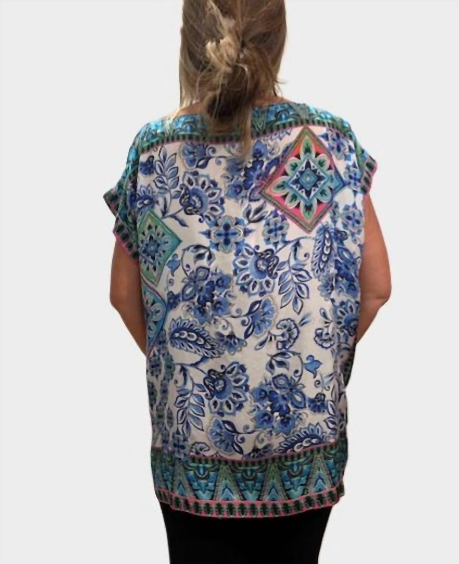 A timeless blouse that will never go out of style. Crafted from 100% sumptuous silk, the Shiro Buttoned Down Shirt from Johnny Was is adorned with a bold, scenic pattern accented with vibrant color. Featuring a banded collar with a button-front, this relaxed-fit blouse offers Dolman sleeves and side slits. Pair with coordinating silk pants or leggings and kitten heels for a posh resort-ready ensemble. The model is 5'10" and wearing a size M. Hand Wash