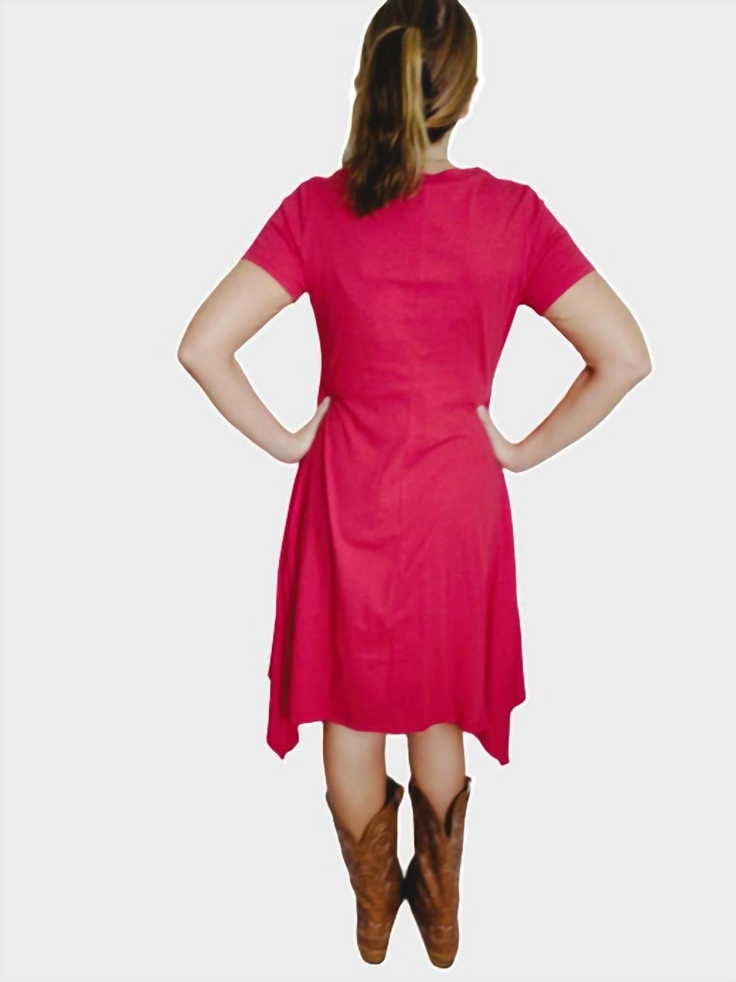 Casual, comfortable and cute! The dress that you'll be reaching for all season long. Graceful and eye-catching, Handkerchief Knit Dress - Nicolette features a stunning floral and butterfly motif across the bodice, creating a beautifully balanced design. The soft, flowy fabric moves with ease, while the handkerchief hem adds a touch of flair and movement. It is styled with short sleeves and a crew neckline. Equal parts comfy and captivating, this embroidered dress is perfect for garden parties, weekend getaways, or whenever you want to feel effortlessly adorable. Model is 5'1" and wearing a size Medium. Machine Wash.